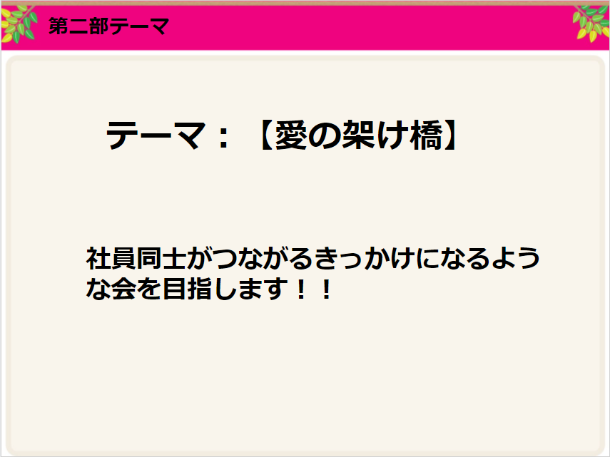 ●テーマ: 「愛の架け橋」 ←社員同士が繋がるきっかけになるような会を目指す