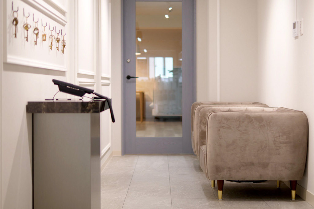 照明は柔らかく、落ち着いた雰囲気になっています。またホテルのロビーのようにお客様がゆったりお待ちいただけるようにソファーも設置しています。