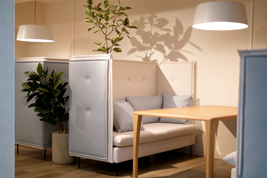 会議室といえば"固いイメージ"があるかもしれませんが、BEASTARではソファーとクッションを配置してリラックスできる空間になっています。会議室スペースではオンラインでの会議や面接時だけでなく、個室で黙々と集中して業務に向き合いたいときにも使用できます。