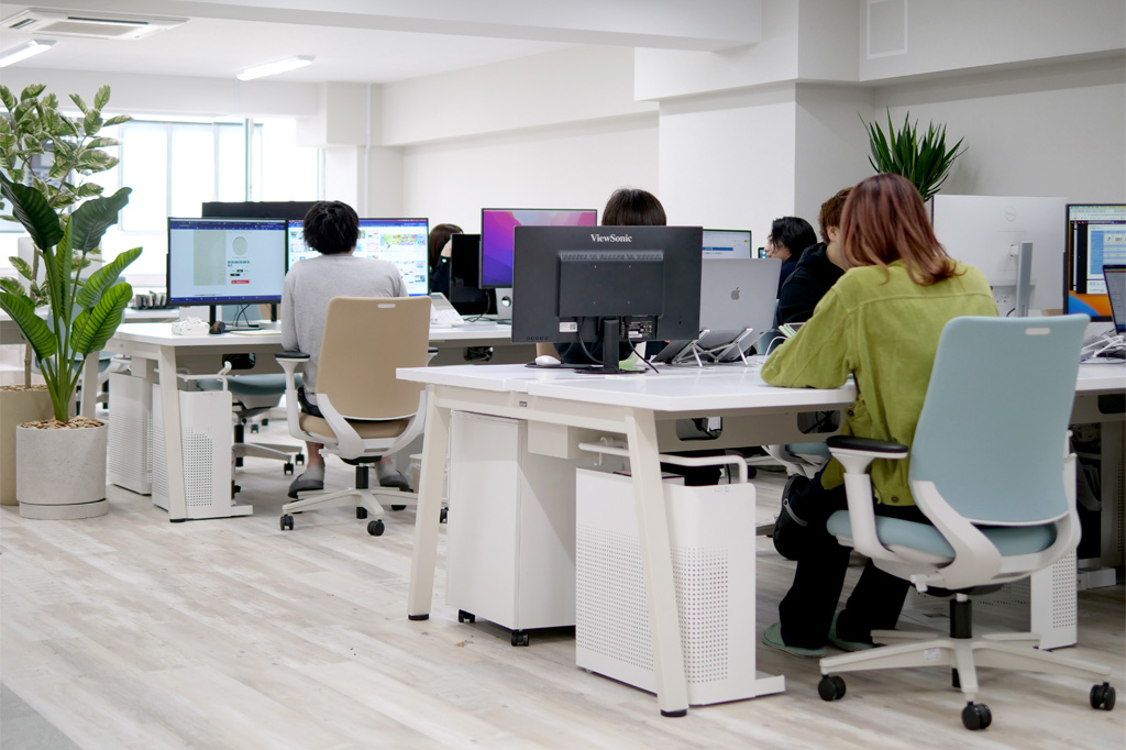 メンバー同士のコミュニケーションが取りやすい執務スペースです。またデスクは人数が増えたとしても配置替えがしやすいものを選んでおり、フレキシブルな対応が可能になっています。