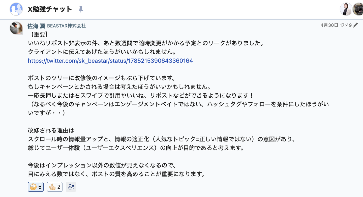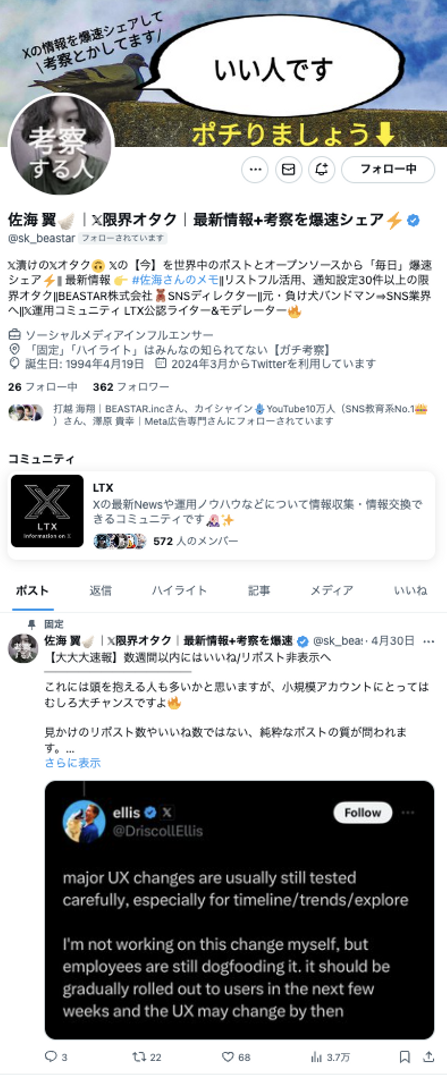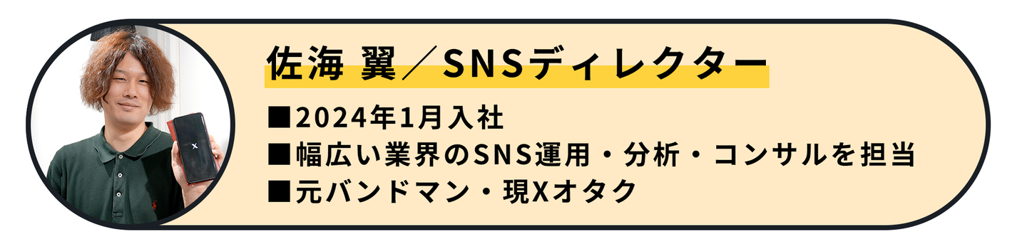 私の場合はSNSの中でもXが特に好きで、入社後にXの最新情報やアルゴリズム分析を発信する個人アカウントを立ち上げたのですが、
