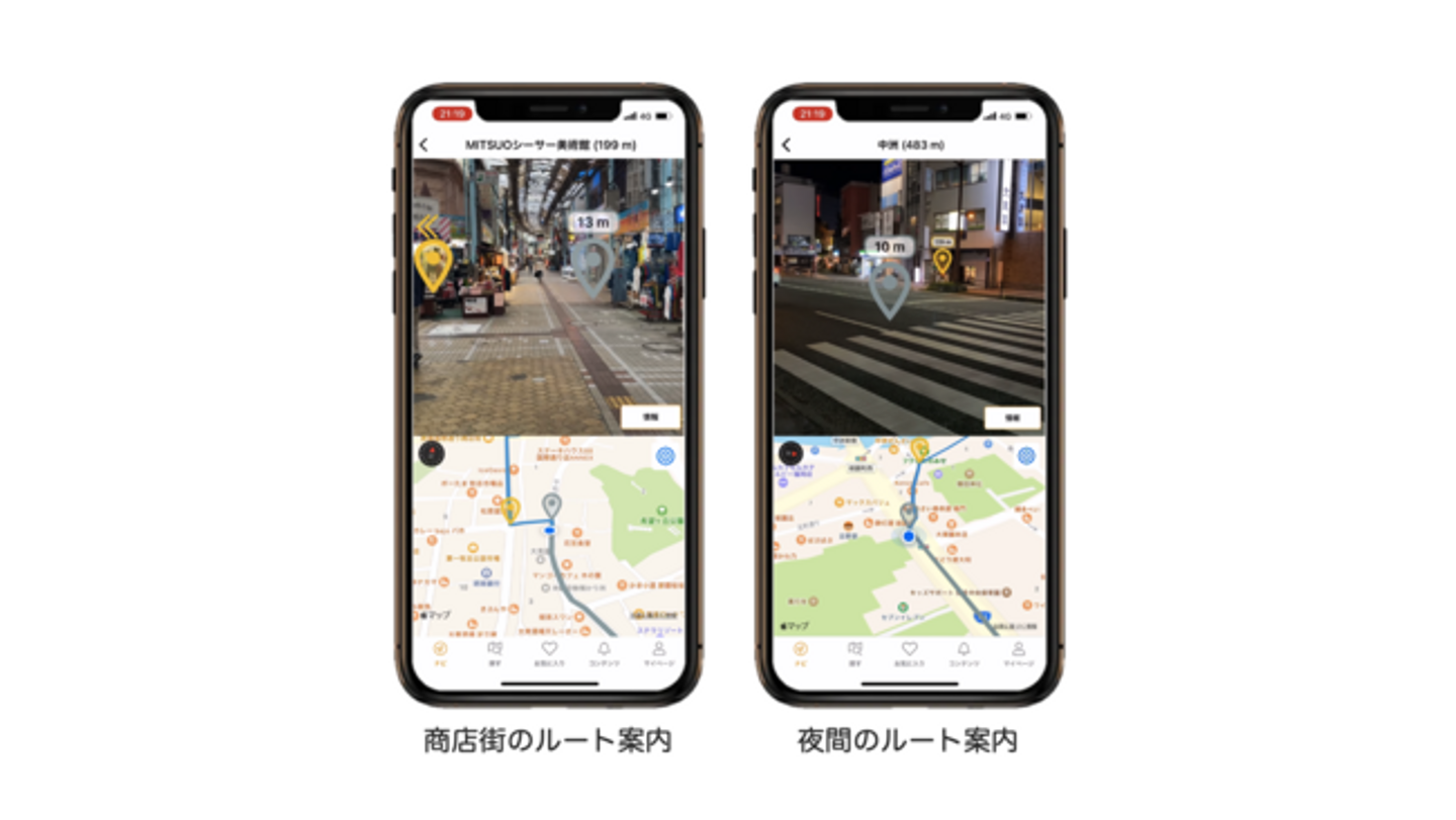 特に弊社ならではのGPS+独自の補正技術により、「歩道を正確に認識し、商店街や細い道等を通るルート案内」「夜間における案内」「世界各国でARナビゲーション」を実現しています。