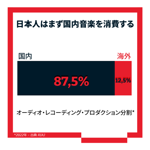 日本の音楽消費は非常にドメスティックである。これは年によって異なるかもしれないが、フィジカル・セールスでは通常、国内90%対海外10%程度である。20221年は88%対12%だった。私たちの分析によれば、この比率はデジタルでもほぼ同じである。