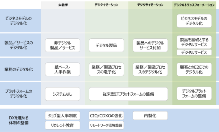 の3フェーズが定められています。また、これらのフェーズは、ビジネスモデルそのものや個別の業務といった各領域において、どのくらい着手されているかの指標としても使用されています。