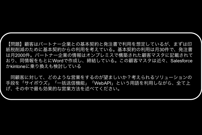 また、顧客マスタとクラウドサインをWebAPIで繋ぐべきか、それとも今からSalesforceに乗り換えるべきか、はたまたkintoneにすべきかなど、技術的な選択の仕方も複数パターン存在します。そうなると、組織として推奨する営業方法を統一する必要があります。