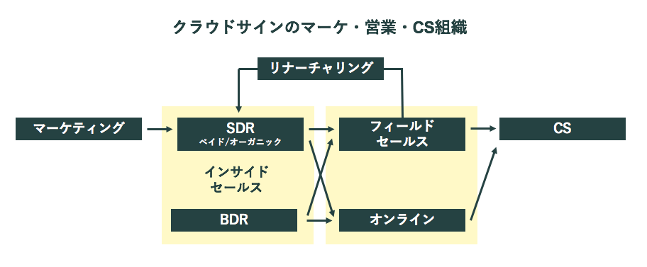 上記課題①②を解決するためにクラウドサインでは、セールス組織を以下のように細分化しています。