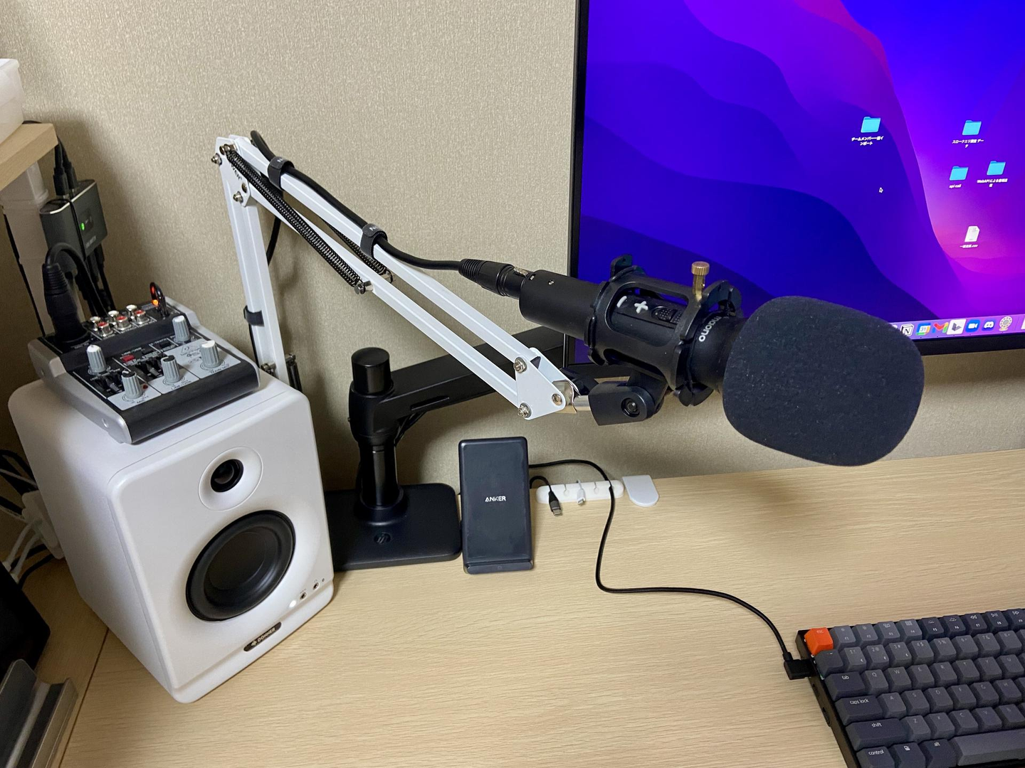 マイクはデスク上で邪魔にならないように、アームを使用して可動できるようにしています。スピーカーの音やキーボードのタイピング音がマイクで拾われて雑音にならないように、口元の音だけを拾いやすい単一指向性のダイナミックマイクを使用しています。
