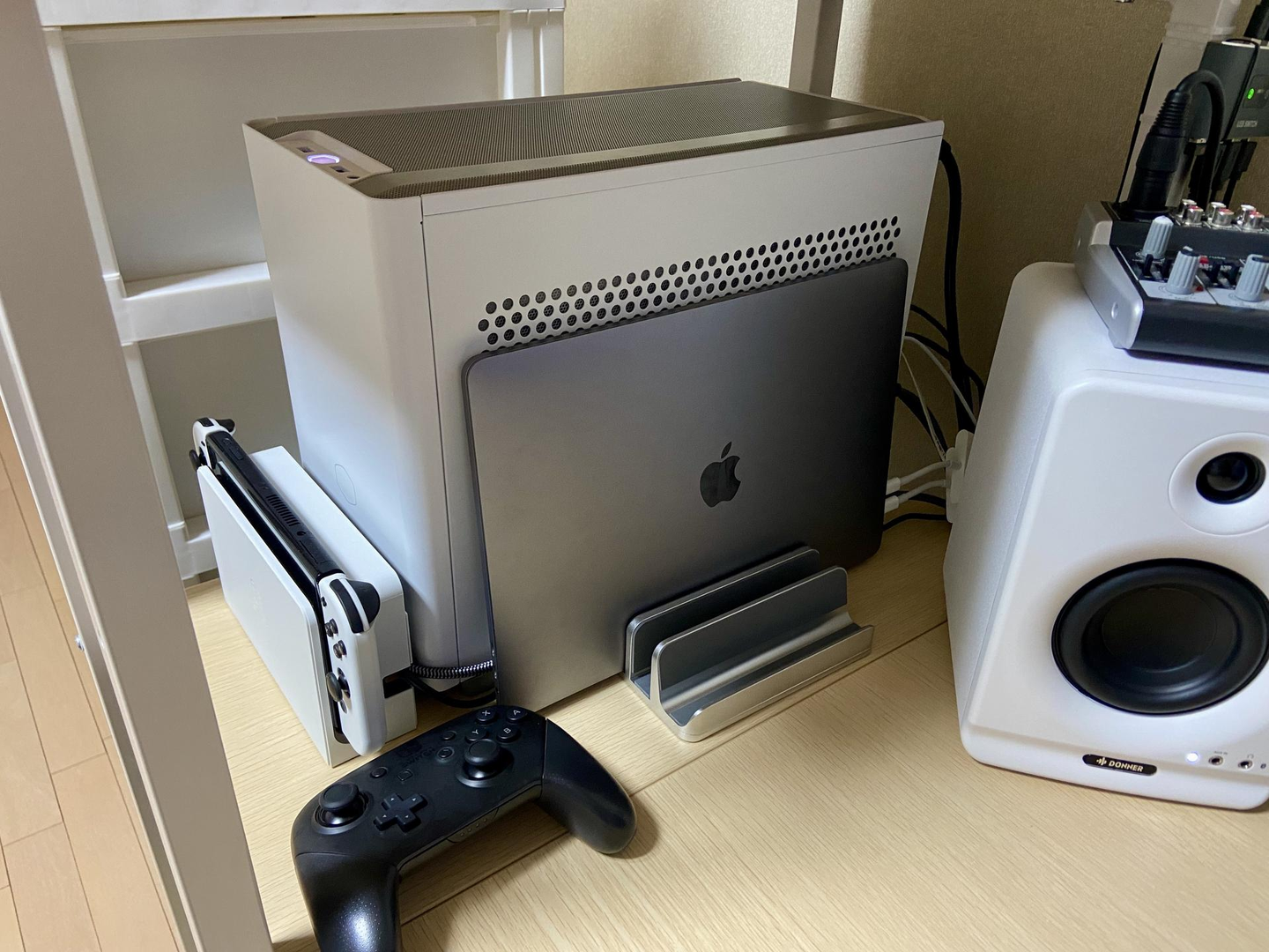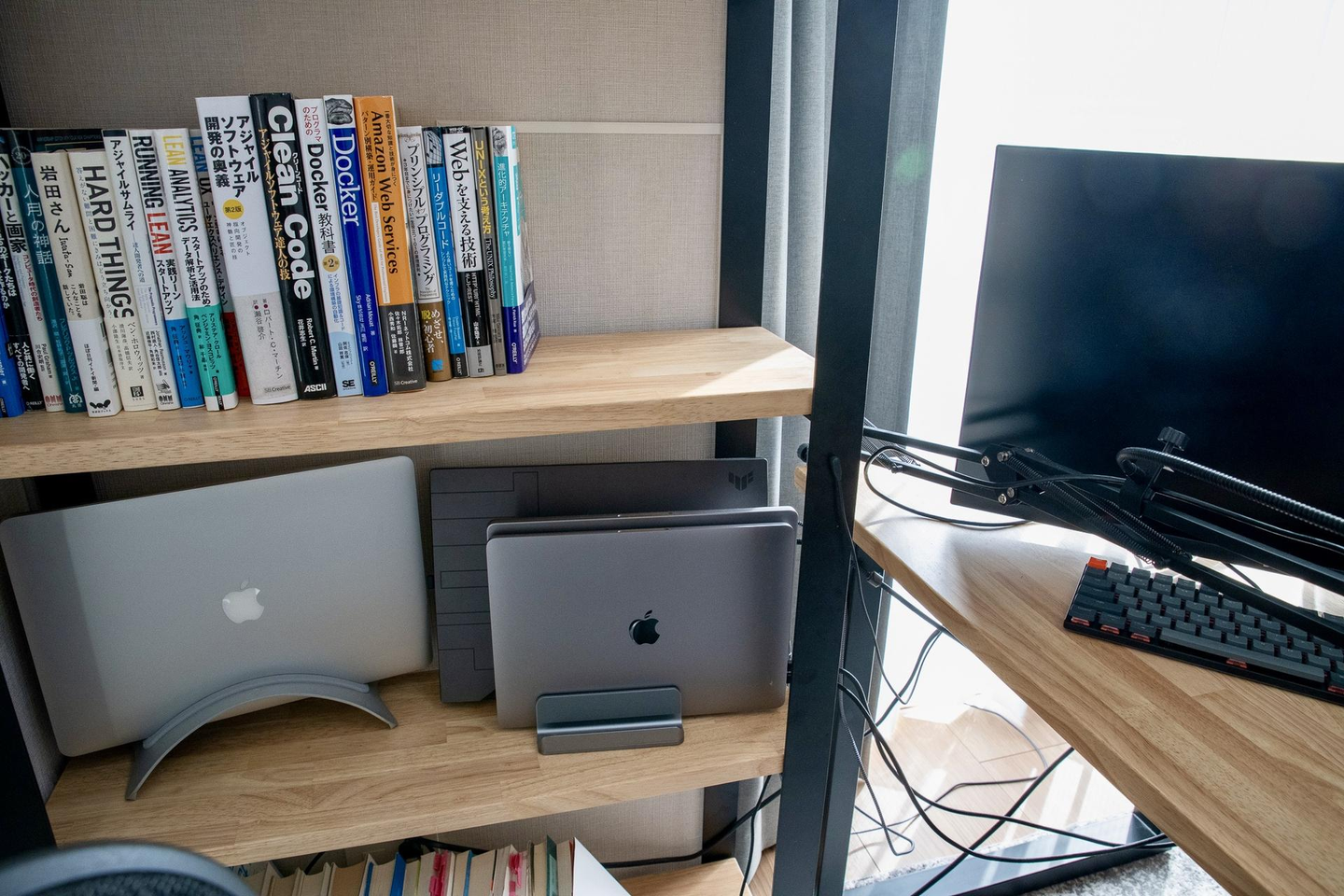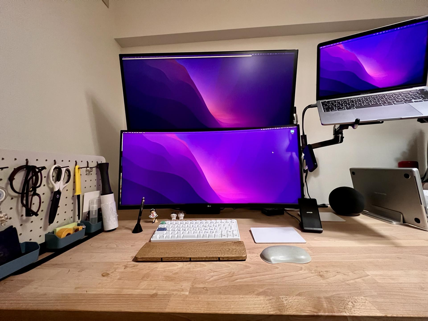 業務用のPCとして支給されているMacBook Proは、外部ディスプレイのみで利用して、本体は閉じた状態(クラムシェルモード)にすることで、デスクトップPCと同じ使用感にしています。本体ディスプレイはサイズが小さいため視認性が低く、デスク上にPCを置くと占有面積が大きくなるので、こういった運用としています。