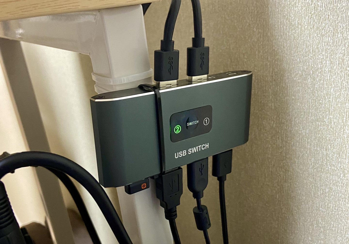 プライベートと仕事の業務で同じデスク環境を利用しているため、切り替えが容易な環境を実現しています。USB切替スイッチを配置して、そこに各種デバイスを接続しており、スイッチを押すと接続先が私用PCと業務PCで瞬時に変わるようになっています。