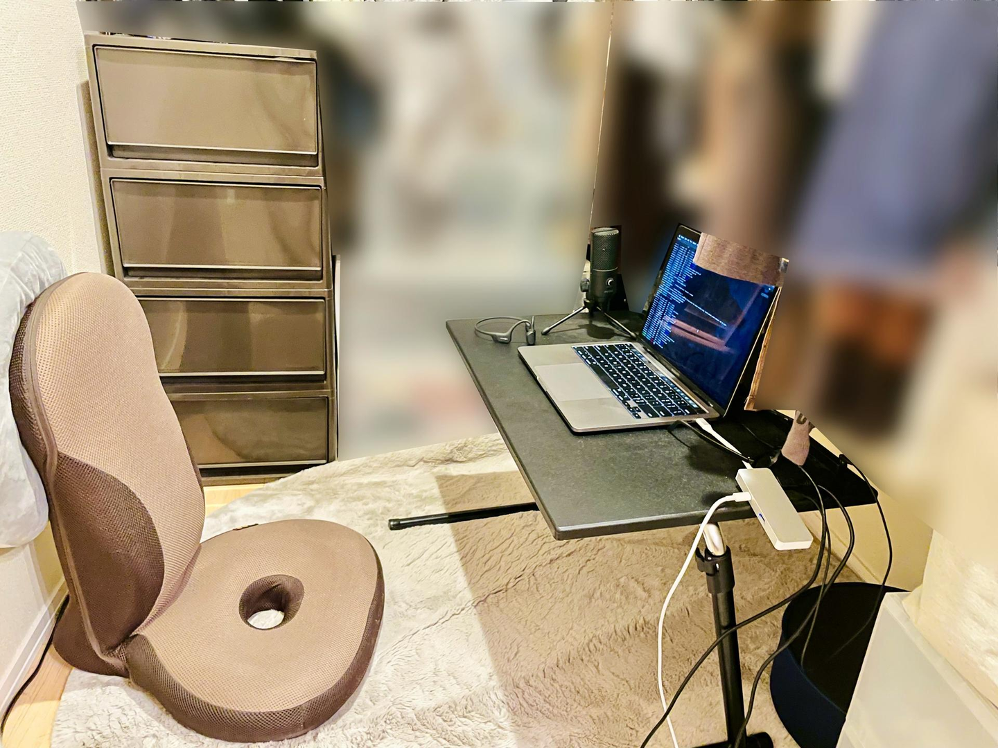 以前の自宅は1LDKで、妻と同時に在宅勤務をするのが困難でした。広さ的には頑張ればなんとかなるのですが、二人ともMTGが多いため、同時にMTGをするのが難しく…。そのとき、「クローゼットは音が反響しないし、外部のノイズも吸収されるから録音環境に良い」という話を思い出し、試しにウォークインクローゼットの中にワークスペース環境を作ってみました。確かにオンラインMTGをするには良い環境で、それから私はクローゼットの住人となることになりました。
