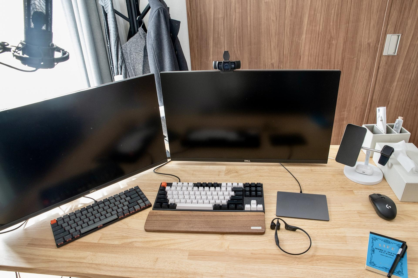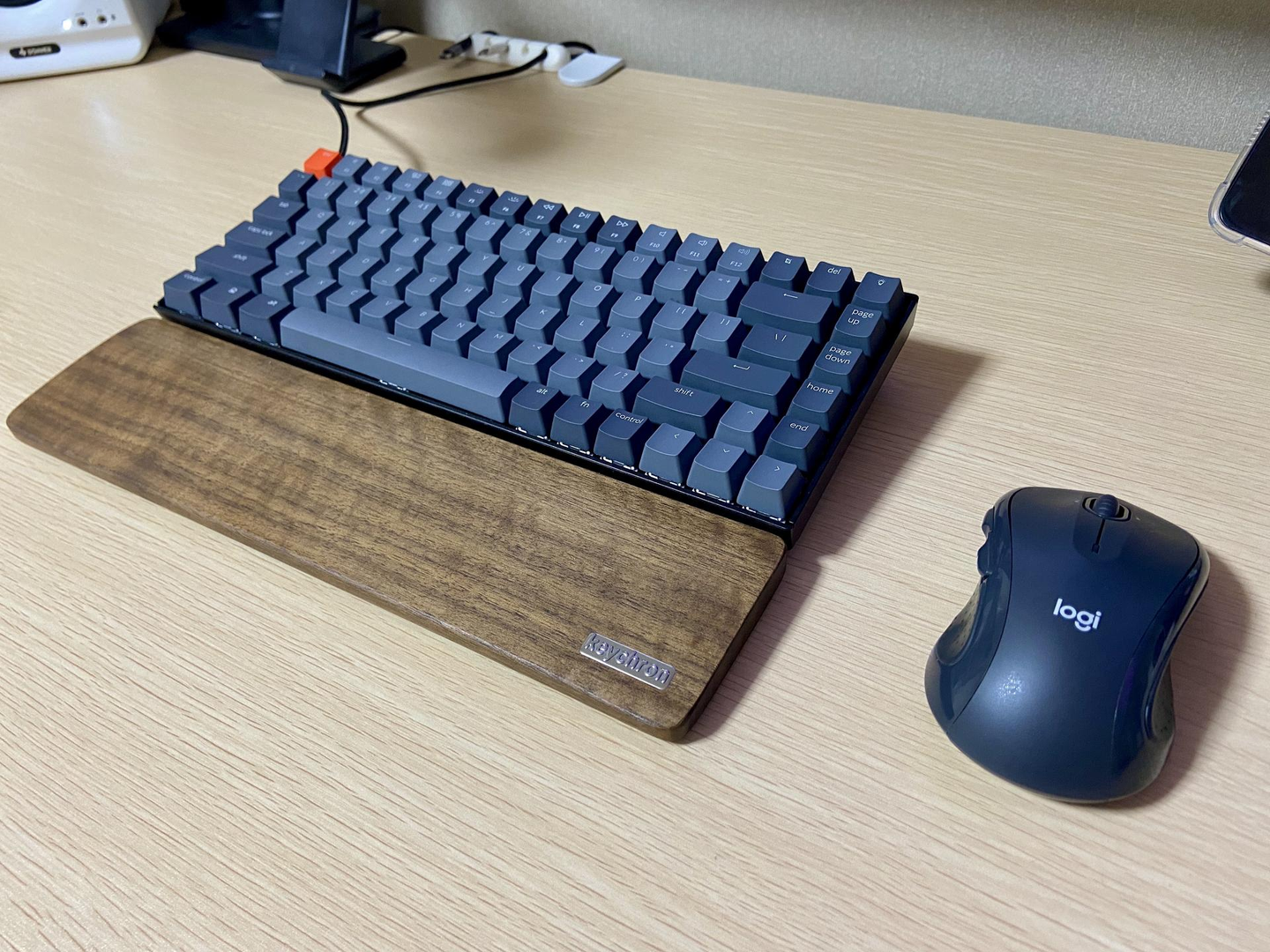出来るだけデスク上での占有面積を小さくするため、Bluetoothによる無線接続、テンキーレスキーボードを使用しています。また、タイピング時の手首への負担を軽減するため、パームレストも利用しています。