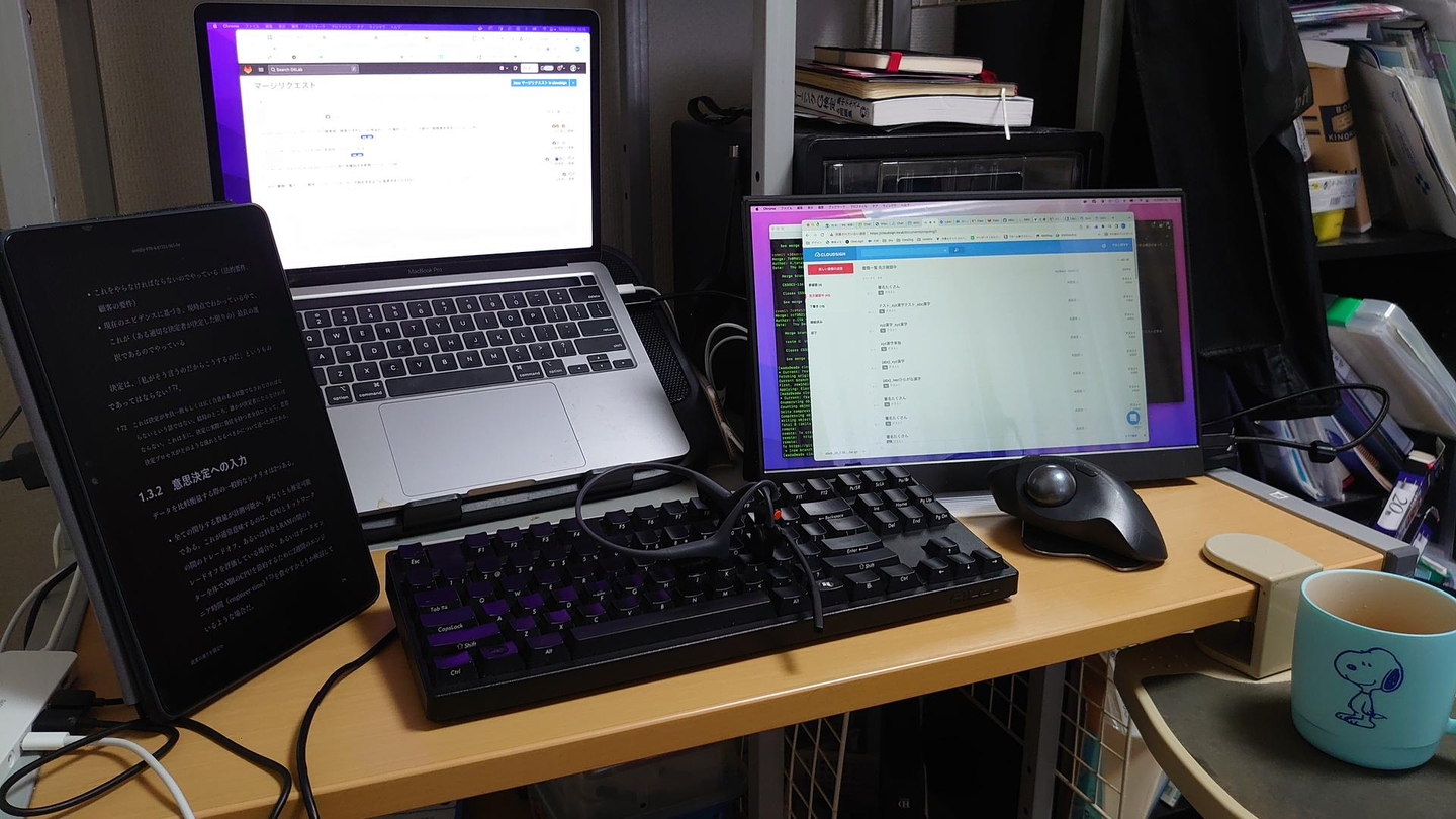 34インチモニター:mtg画面、投影資料、映さないが確認したい資料、議事録 24インチモニター:Slack Macモニター:Google カレンダー or Trello 34インチモニターは、3〜4つウィンドウを並べても十分に見やすい大きさがあるため非常に重宝しています。投影資料の補足資料の準備や、mtg中に話題になっている内容を確認して話せるように準備するなど、画面が多いとmtg画面を見ながら+α何かを行う事ができます。