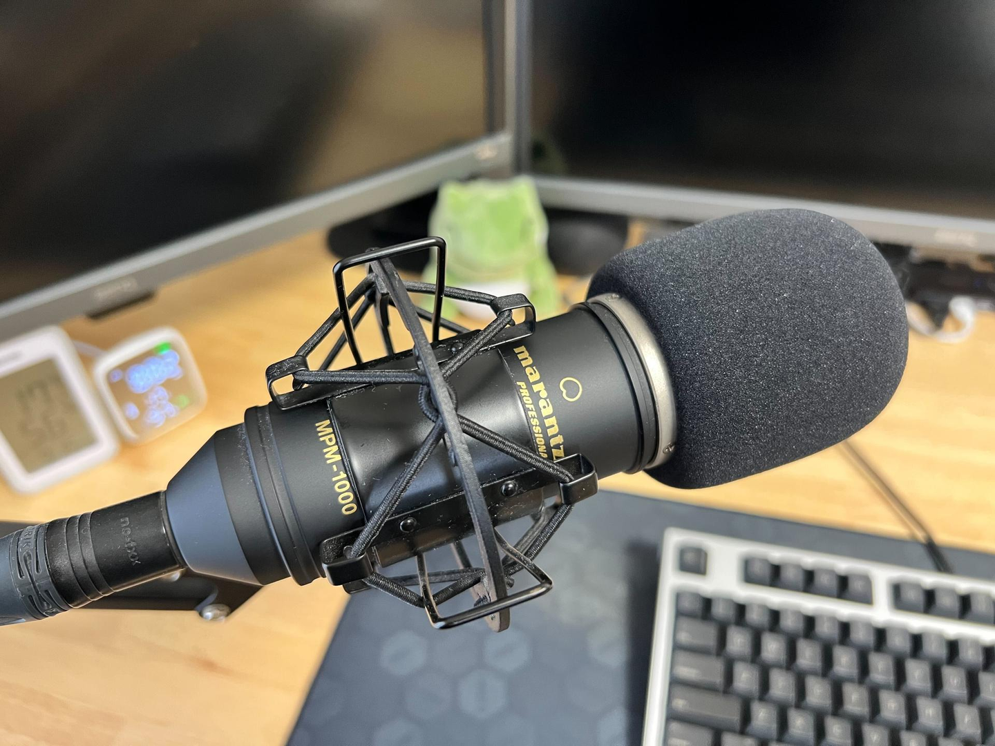 入力デバイスとして使用しているのはmarantzのコンデンサマイク「MPM-1000」です。正直オーディオ関連デバイスについては詳しくなく、とりあえず音が鮮明に聞こえたほうが良いのでは?ということでコンデンサマイクを選択しました。「MPM-1000」は単一指向性のマイクなので、集音部を自分の方に向けることで他の方向からの音が入りづらくなるのが良い点です。また、コンデンサマイクはダイナミックマイクに比べて価格が高くなる傾向にありますが、「MPM-1000」は6,000円前後とお手頃で手が出しやすいのも良い点です。さらに、簡易スタンドやキャノンケーブル、ウィンドスクリーン、ショックアブソーバといったアクセサリが付属している点もオススメです。