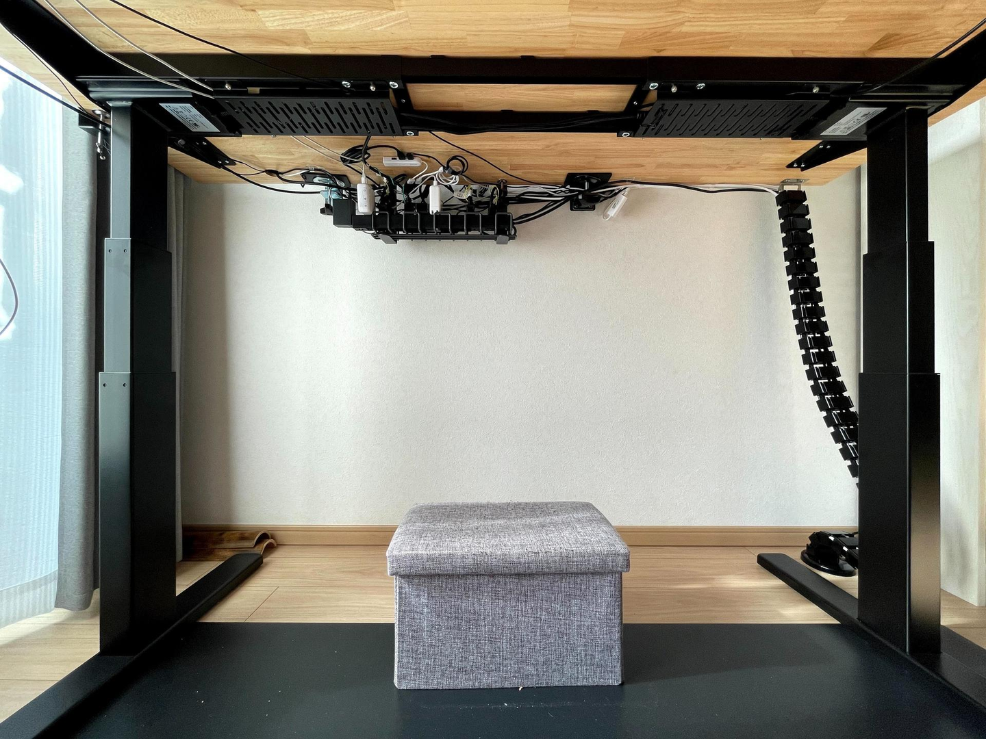 2. ケーブル類の処理 この広い作業環境をより広く使うために、モニターはそれぞれエルゴトロンの「LX モニターアーム」で固定し、ケーブル類は全てモニター裏や天板下に収納することで視界に不要なものが入らないようにしています。