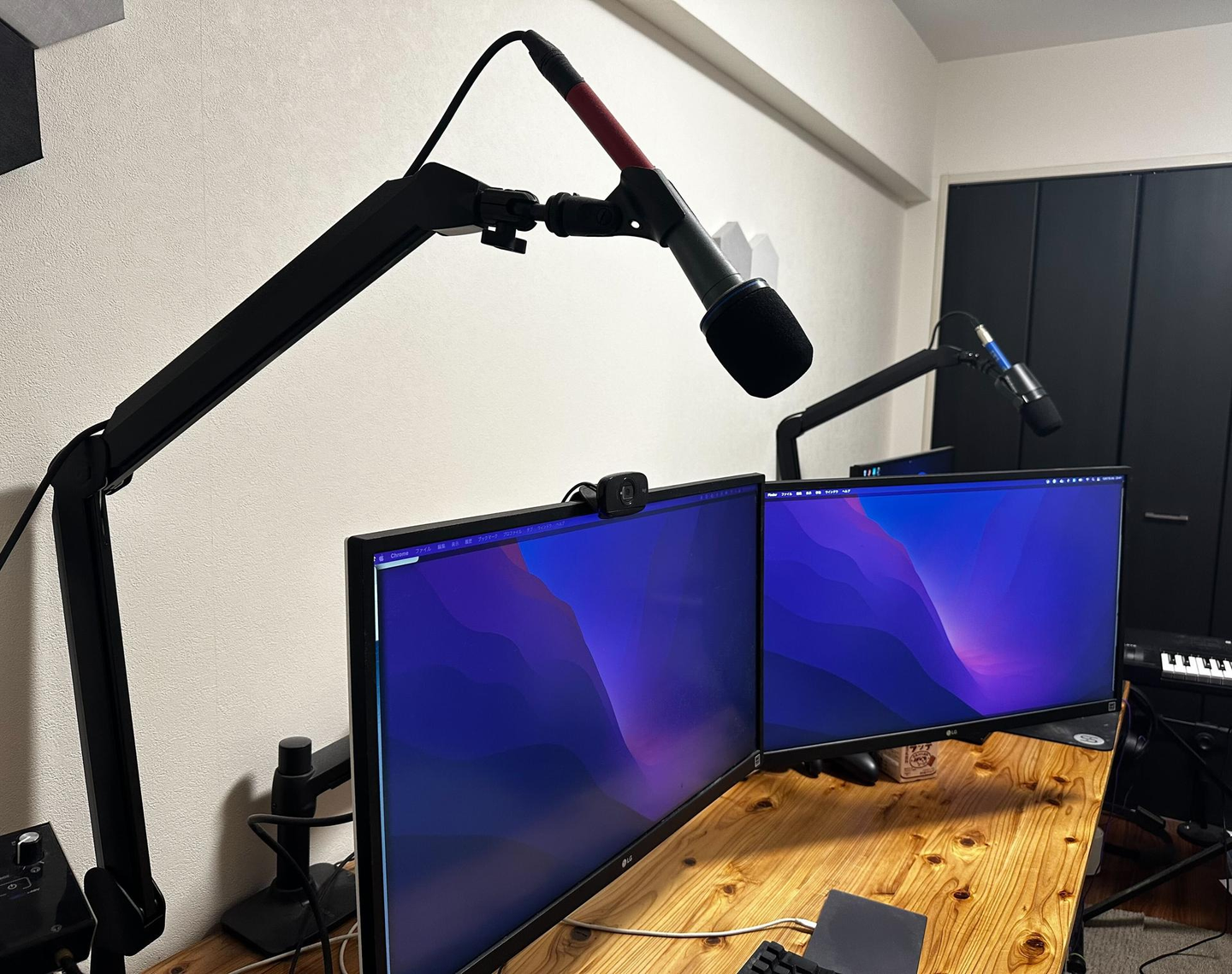 また、マイクアームを使うことによって机の上を広く保つことができるのでマイクアームはほぼ必須かと思います。過去にマイクスタンドを使ったこともありますがやはり邪魔でした。