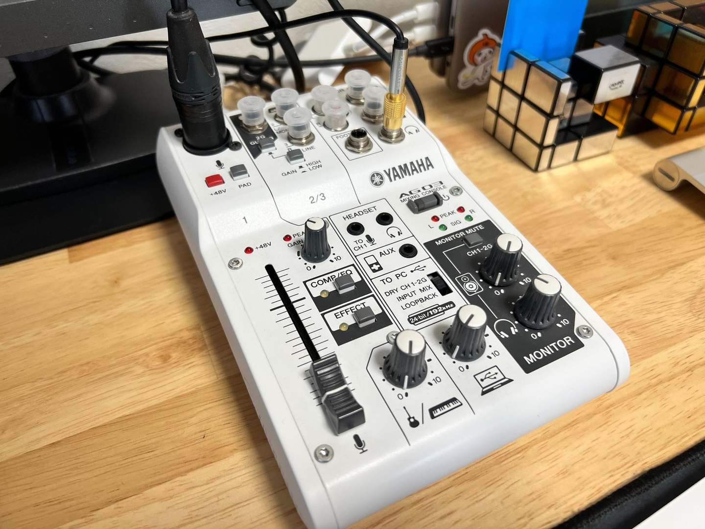 また、マイクとスピーカーの音管理を一元的に行えるようにするために、オーディオ・インターフェースを用いています。ヤマハの「AG03MK2」に備わっている機能によってマイク入力の音をPCのみへ流すようにすることで、オーディオ・インターフェースで発生しがちなスピーカーから自分の声が聞こえる現象も防いでいます。