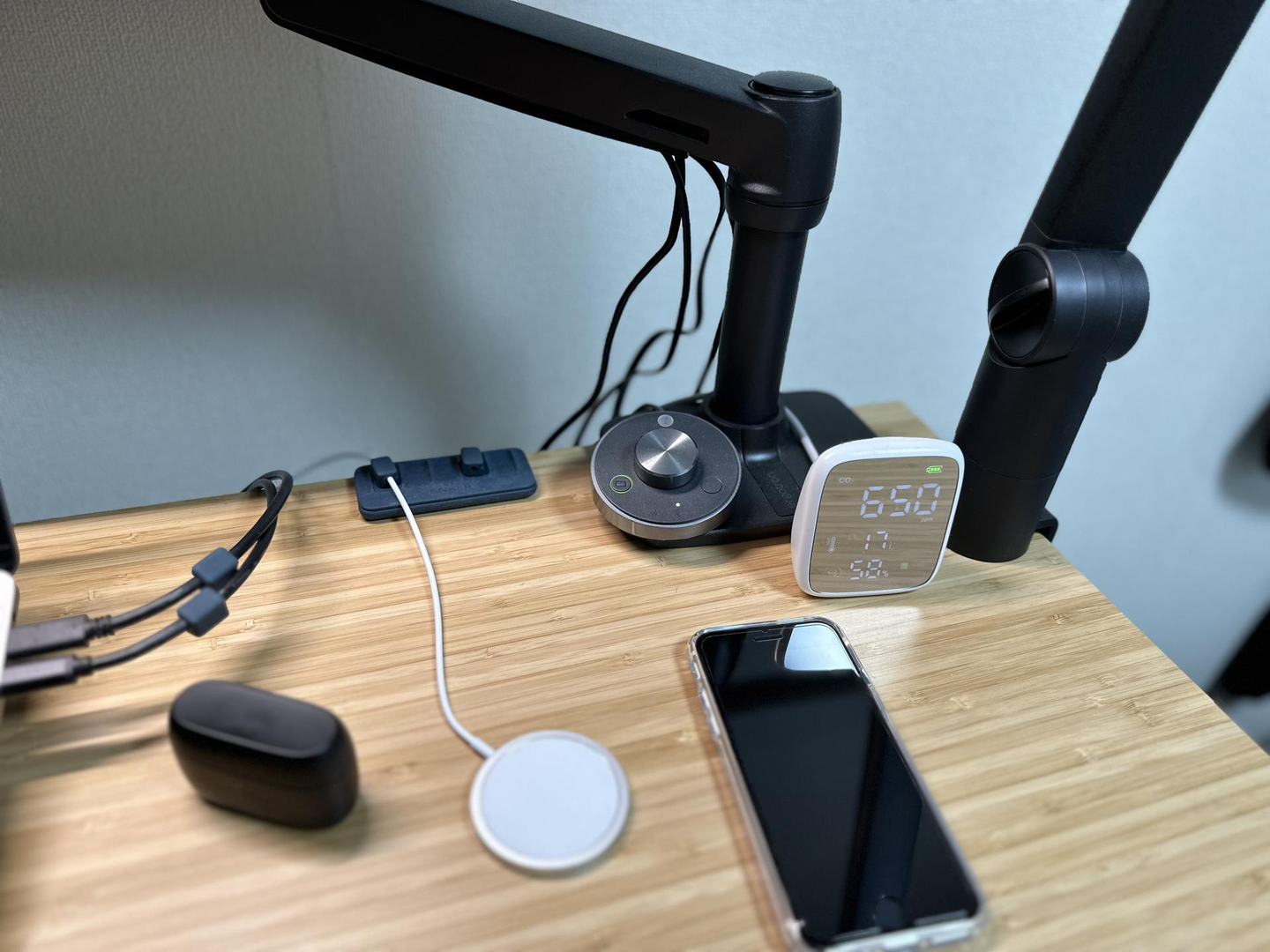 耳をふさがないデザインで、周りの音もヘッドフォンの音も聞こえる 意外と音がいい 軽い ノイズキャンセリングブームマイク付きで、こちらの声に周りの騒音が混ざったり、ヘッドフォンの音が回り込むことがない 1時間くらいで充電でき、1日使える(5分くらいの充電で2時間使えるらしい) ーー オンラインmtg環境にこだわらず、購入してよかった機材・アイテムがあれば教えてください!