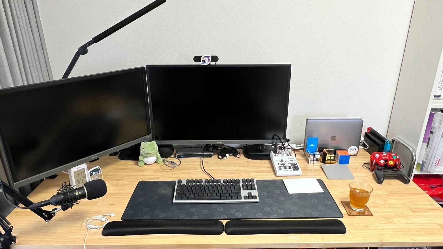 2. マイクの設置はアームで 外部マイクを使う場合、最初はスタンドを使う方が多いと思いますが、手元にはキーボードやマウスもあるので邪魔に感じると思います。そのため、使用する時に口元にマイクだけ持ってこれるようにデスクにアームを固定して可動できるようにしています。特にElgatoの「Wave Mic Arm LP」はモニター下に配置できるほど低い位置で使用できるアームなので、手元の邪魔にはならず視界やWebカメラの範囲にも入らないように使用できます。