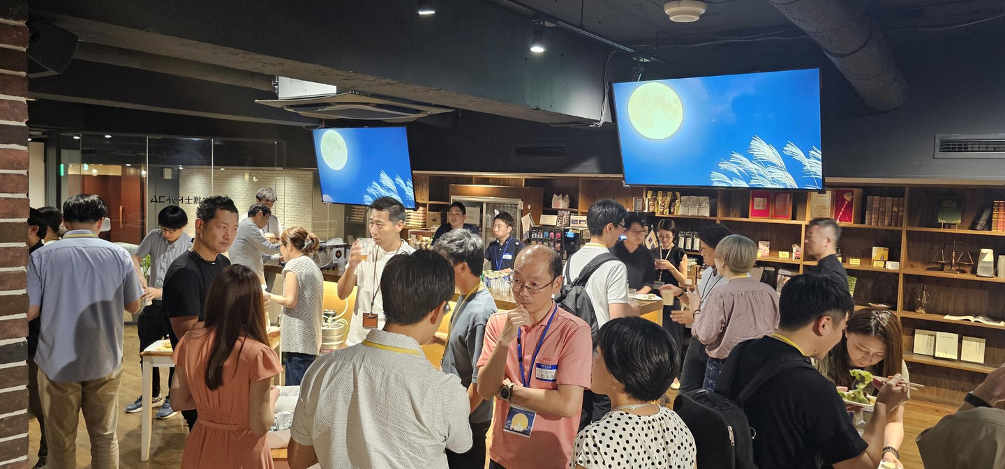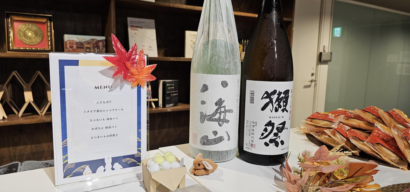 9月13日(金)に開催されたビアバッシュは、「Otsukimi beer bash〜小さい秋見つけた〜」と題し、中秋の名月を前にしたお月見企画を実施しました。当日は、「お月見団子」とお団子に合う日本酒「獺祭」「八海山」が用意され、お酒好きの社員たちに振舞われました。イベントでは毎回元榮さんよりビールサーバーが用意されるため、業務後の一杯を楽しみにラウンジに集まる社員も多くいます。