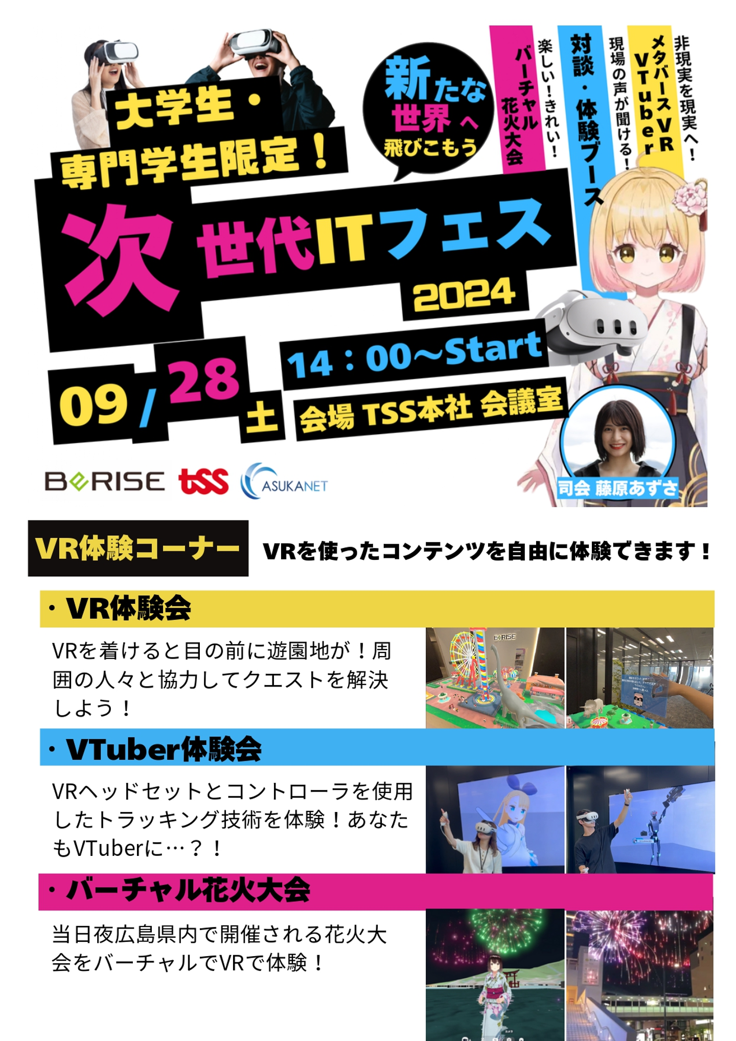 当イベントは、VR・VTuber体験会やバーチャル花火大会、企業によるトークセッション、就職相談会などを行う、業界研究の一環として、楽しくIT業界の最先端に触れることができるイベントです!