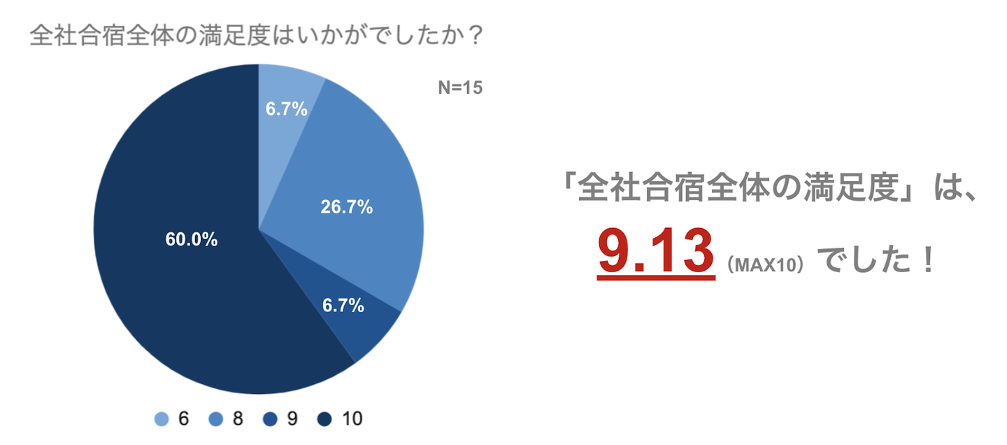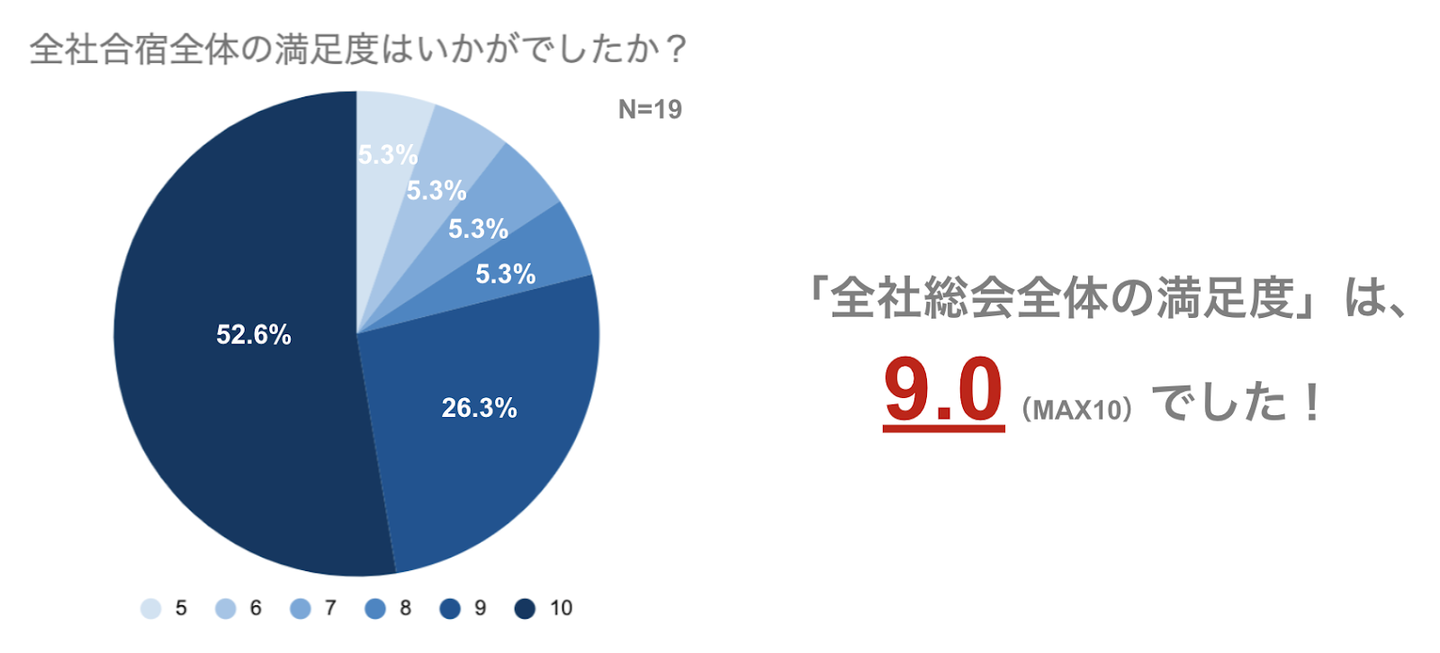 「全員スタメン化」を目的に開催した全社合宿。事後アンケートの結果、全社合宿全体の満足度は、9.0を記録しました。