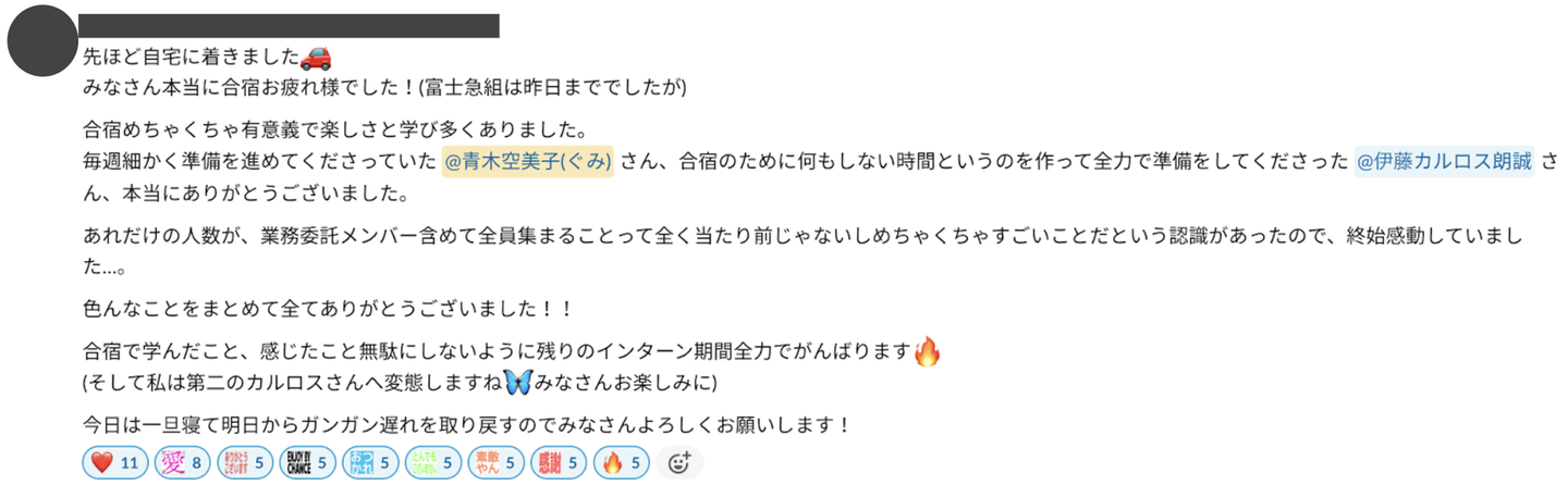準備、当日の運営全てにおいて本当にありがとうございました。楽しみもありつつ、学びや刺激が多く、インターンメンバーも合宿に呼んでもらえるという環境に感謝です。引き続きよろしくお願いします!