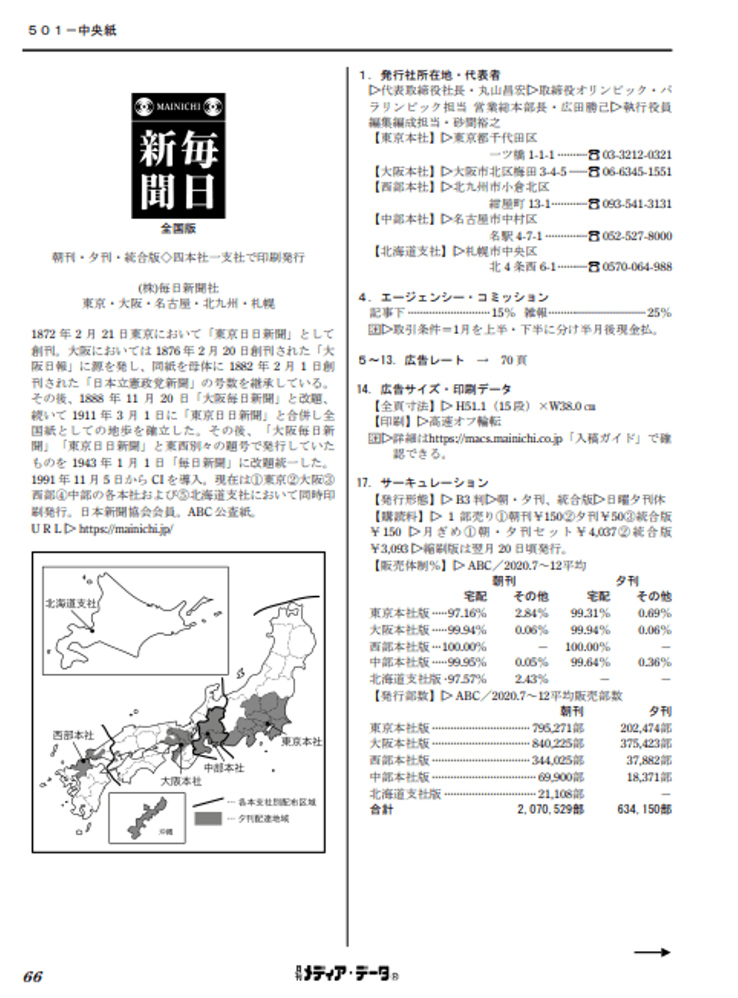 まず1つ目は、マスメディアの媒体情報を網羅した広告媒体資料専門誌「月刊メディア・データ」の出版です。出版にあたり、編集・発行業務、販売管理、媒体への掲載交渉など、業務は多岐に渡ります。メディアの発行部数や読者層、広告料金など、媒体の情報を収集し、それを紙媒体として出版しています。
