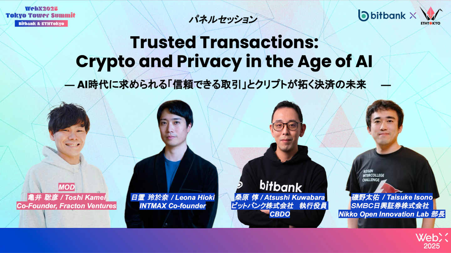 Web3カンファレンス「WebX」のサイドイベントとして行われたこのイベント、パネルセッション「Trusted Transactions: Crypto and Privacy in the Age of AIーAI時代に求められる「信頼できる取引」とクリプトが拓く決済の未来ー」では、AIとクリプトがこれからの決済をどう変えていくのかをテーマに、かなり熱い議論が繰り広げられました。登壇者はクリプト領域での経験が長くものすごく豊富な方々ばかりです。