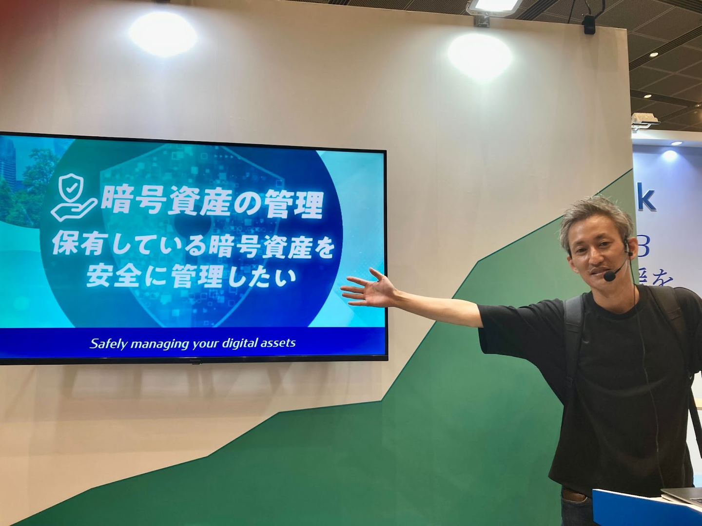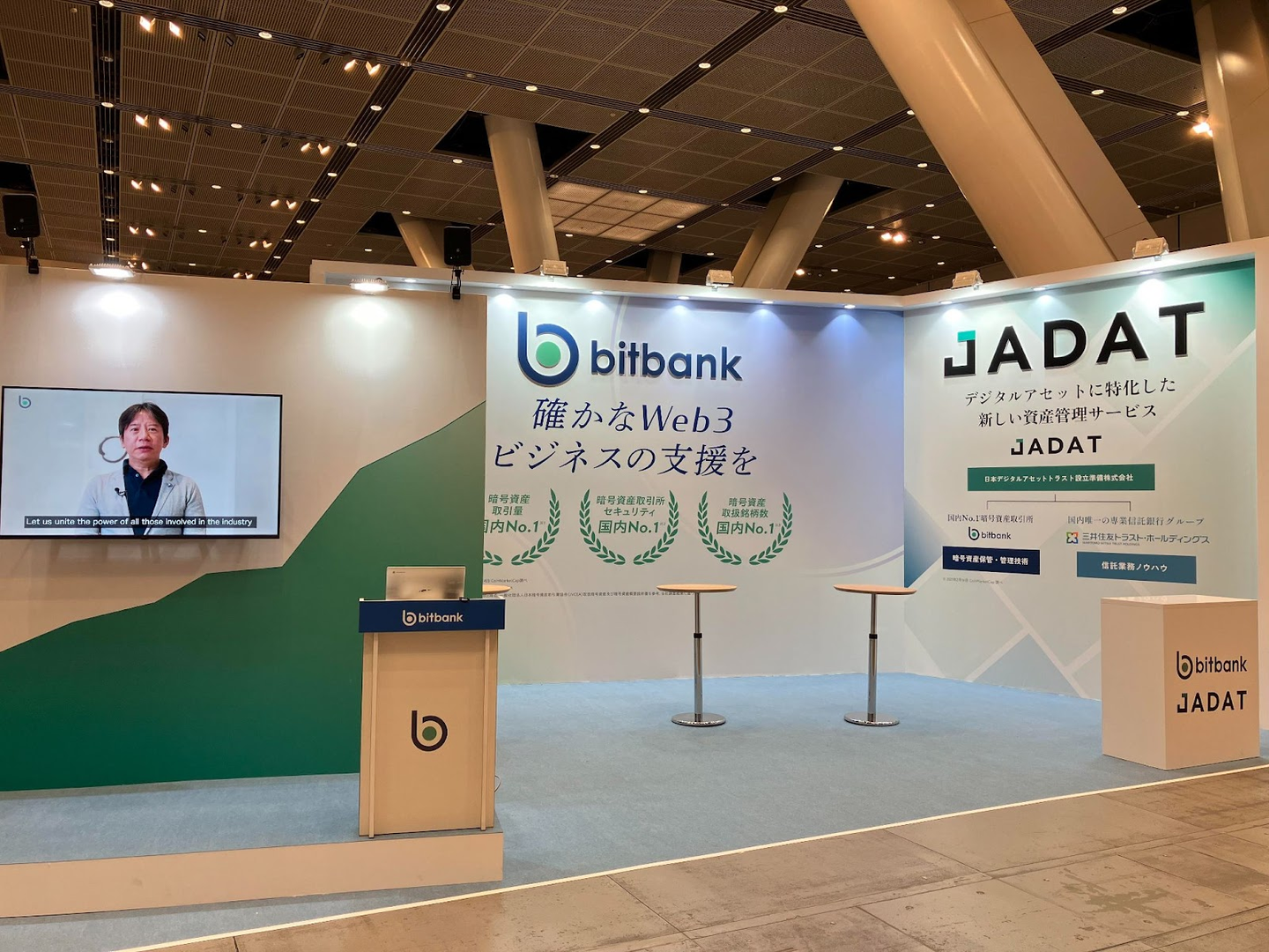 ビットバンクのカラーを基調としたブースも出展し、CEO 廣末さんのコメントもモニターで流していました。