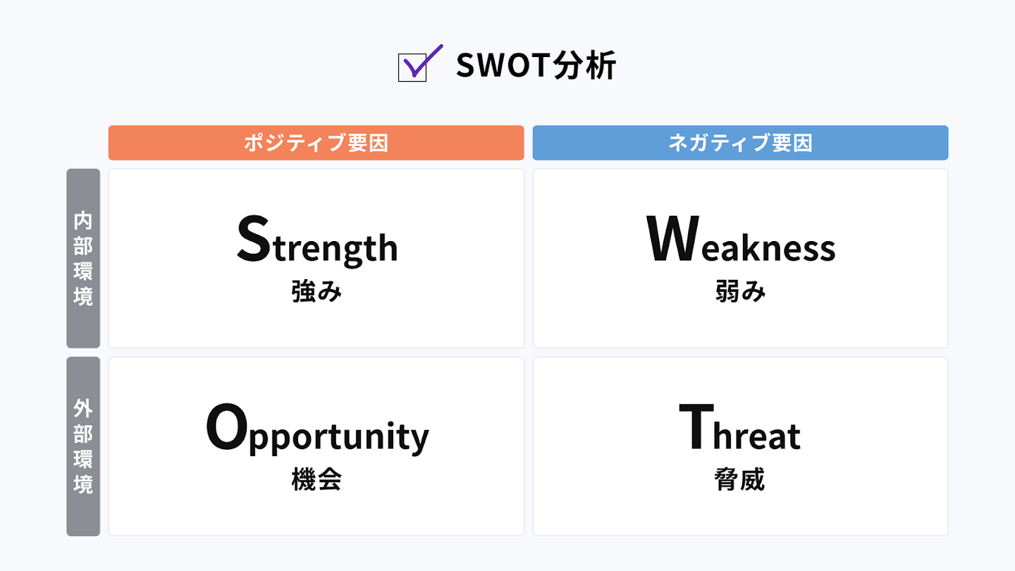 まず、参加者はクリエイター役とマネージャー役に分かれ、ヒアリングのロールプレイを行います。ヒアリングした内容を、SWOT分析フレームワークを用いて内部要因と外部要因、ポジティブな要素とネガティブな要素に分類しました。