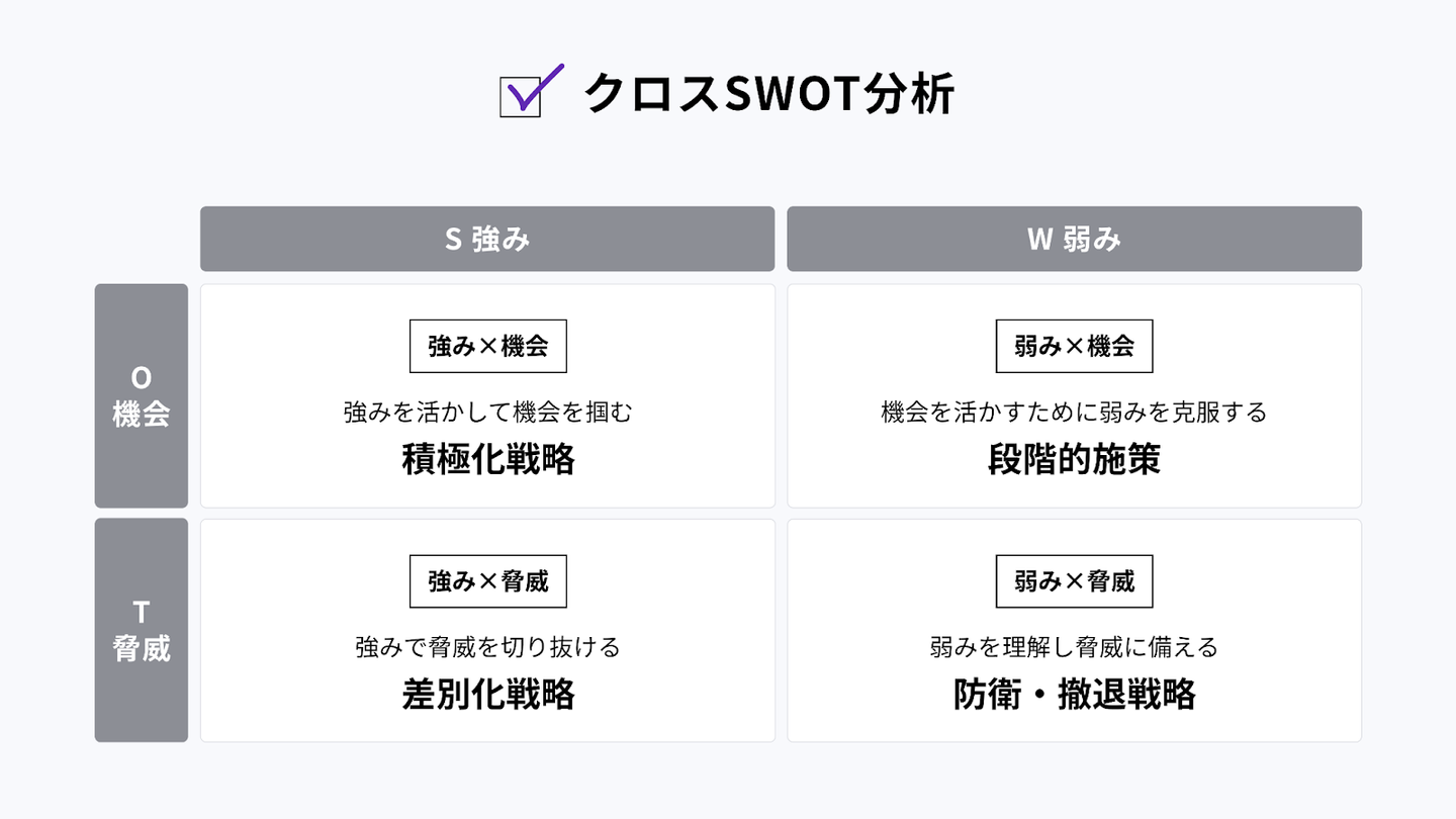 次に、SWOT分析の結果をもとにクロスSWOT分析を実施しました。各要素を組み合わせることで、施策や戦略の新たなアイディアに繋がりました。