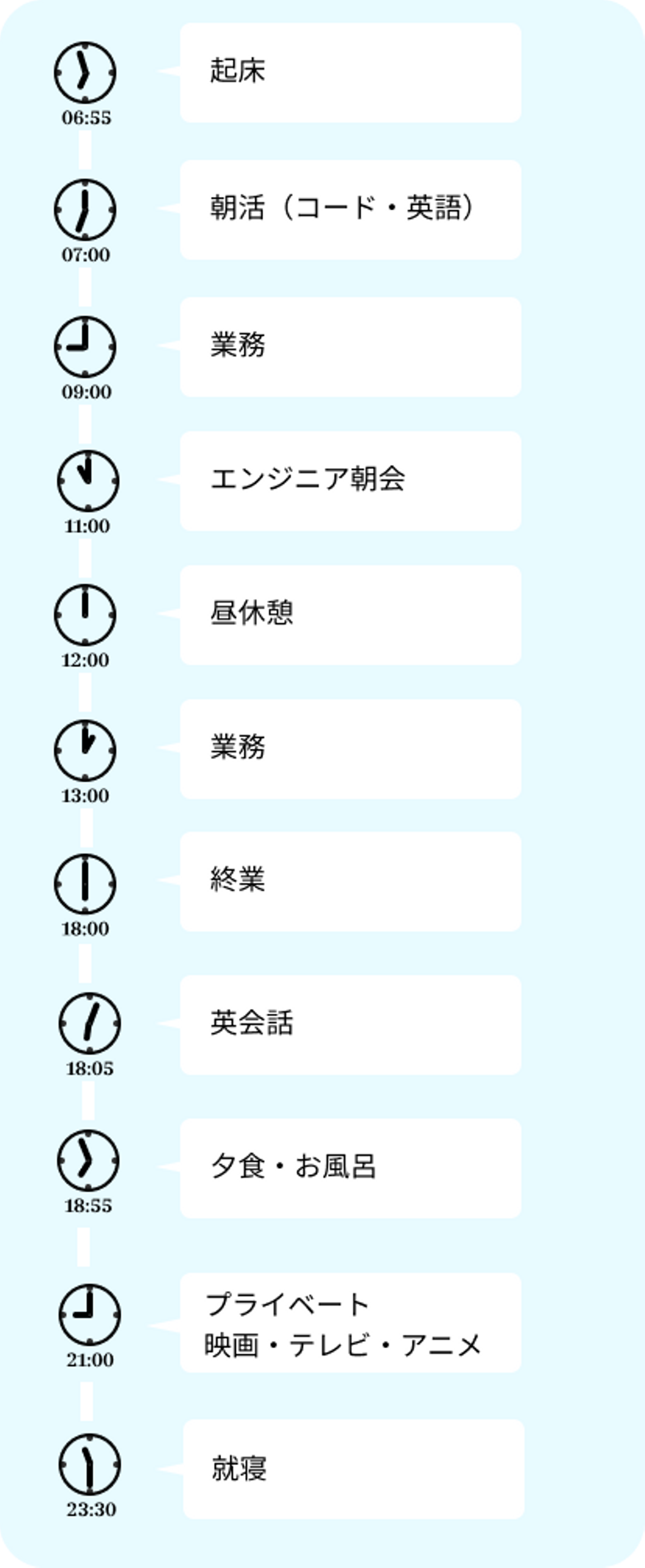 弊社はワークライフバランスがとても良いです。残業もほとんどなくフルリモートなので、プライベートで技術や英語を学習する時間もしっかりと取れます。家族と一緒に過ごす時間も確保できるので、毎日楽しく仕事ができています。