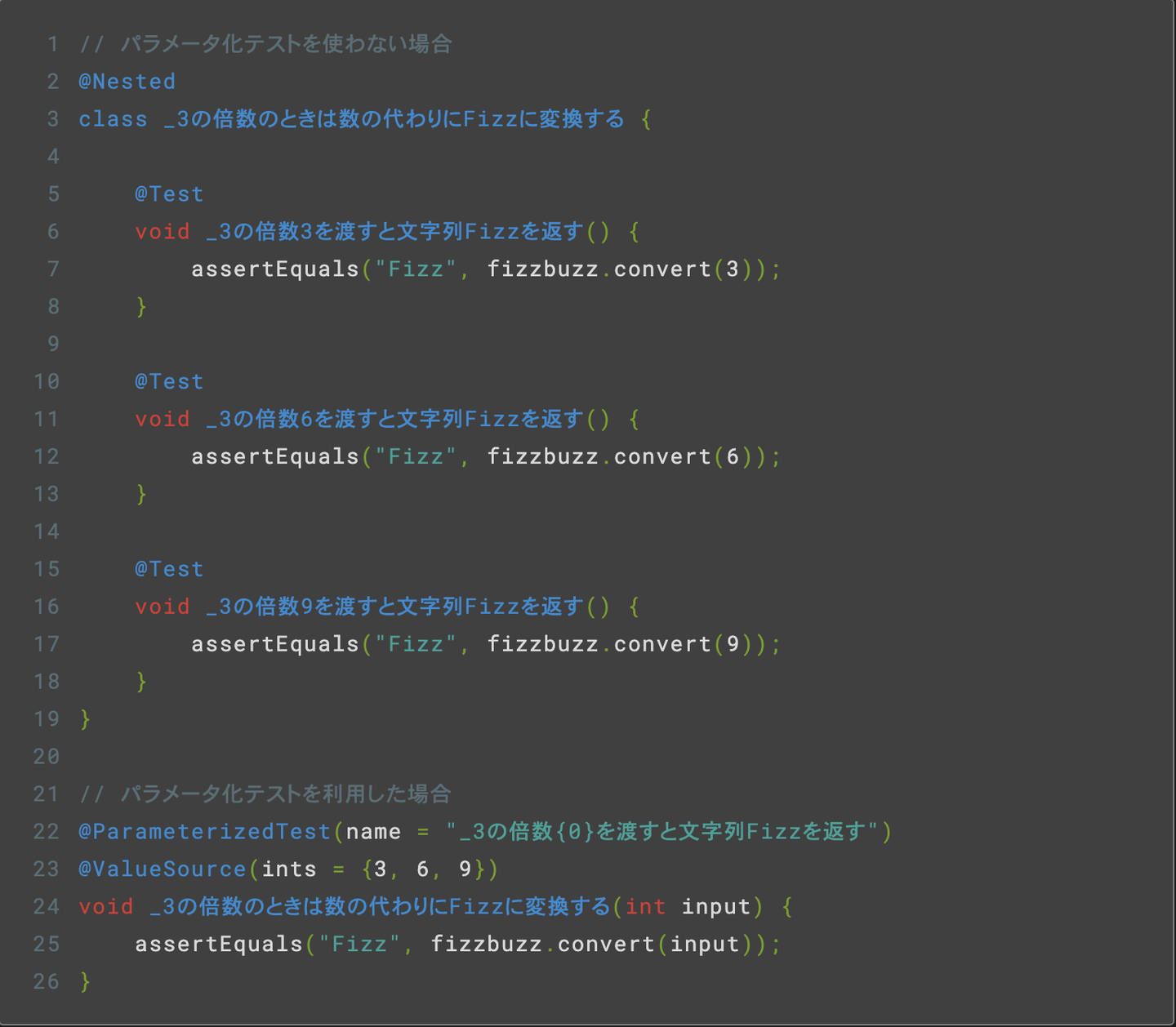 他にもテストケースを必要最小限にして保守の対象となるコードを減らす方法がありますが、ある程度のテストケース数が必要な場合もあります。ワークショップでは「テストケースを減らさず、コード量を減らす」方法の1つとして「パラメータ化テスト」を活用する方法も教えていただきました。