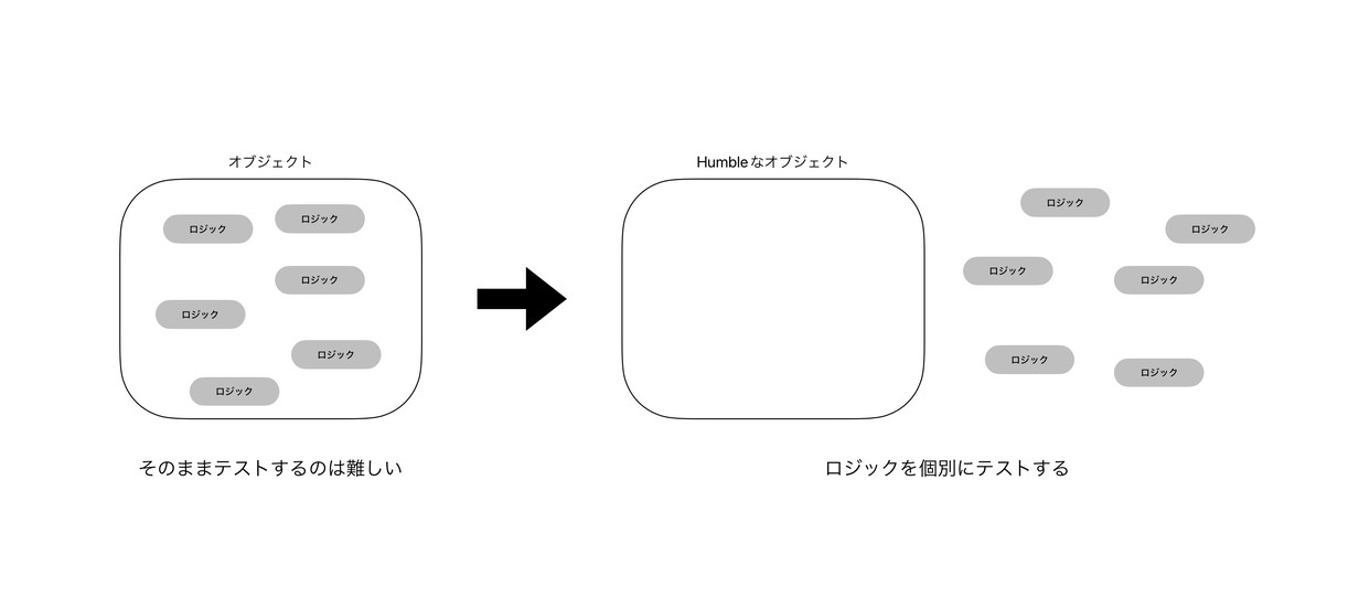というようにプロセスを分割して、テストケースに漏れがないか、正しく実装できているかを確認しながら実装します。 更にオブジェクトやコンポーネントの構成を設計する段階でテスト対象を「テスト容易性が高く、重要度が高いもの」と「テスト容易性が低く、重要でないもの」に分割し、前者を優先的に実装していきます。テスト対象を分割するデザインパターンとしてオブジェクトの中にあるロジックを外に出してテストしやすくするHumble Objectパターンがあることも講義の中で紹介していただき、どうテスト対象を分割していけば良いか学びました。
