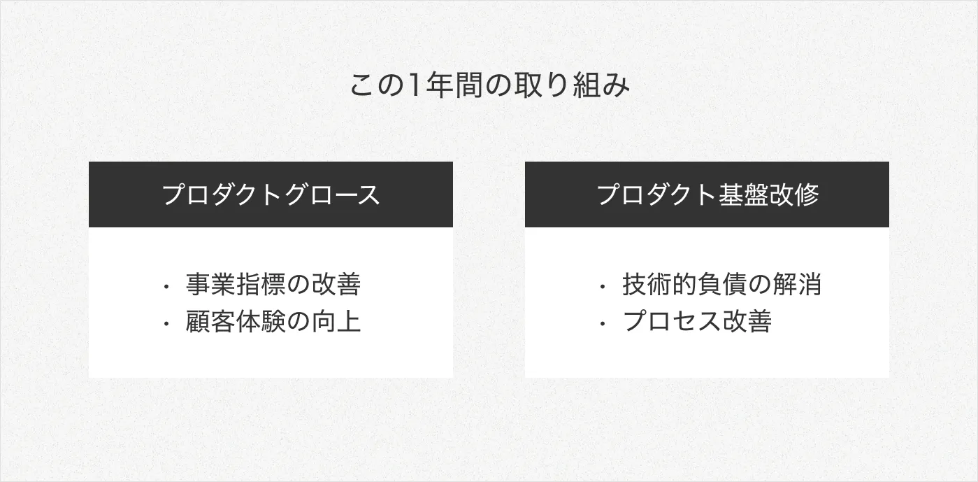 この1年間で取り組んだこととして、「プロダクトグロース」と「プロダクト基盤改修」の2つを軸に業務を行いました。