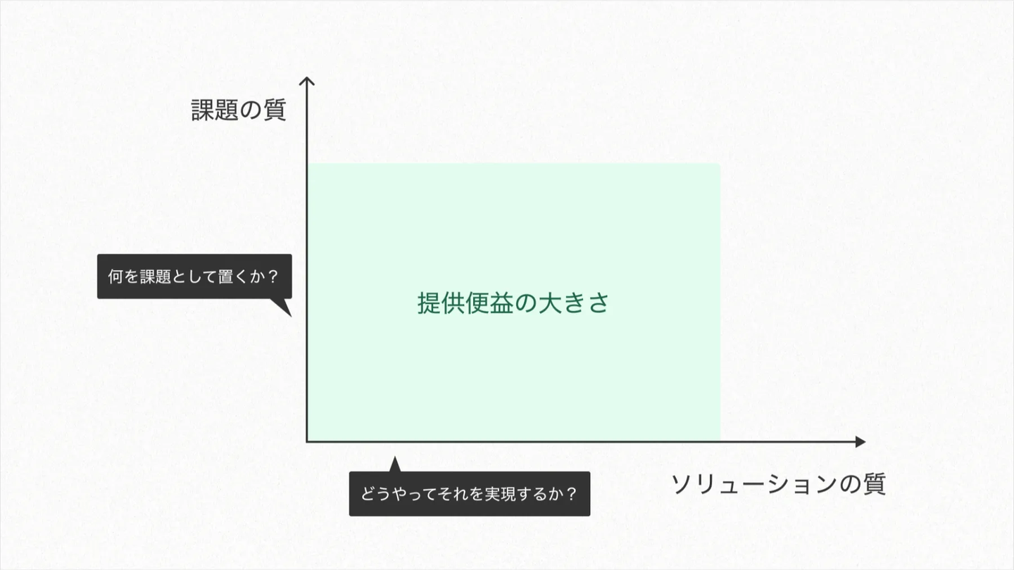 それはもちろんデザイナーとして大事な思考だと考えていますが、ある日、部内のPdM(プロダクトマネージャー)の方から、「プロダクトの提供便益の大きさは課題の質とソリューションの質の掛け合わせで決まる」ということを教わりました。