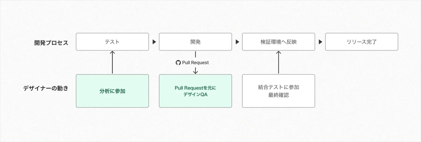 2つ目に、上記のデザインQAフローよりも早期の段階で開発チームのテストプロセスを利用し、デザインや仕様の抜け漏れを検出するフローを追加しました。