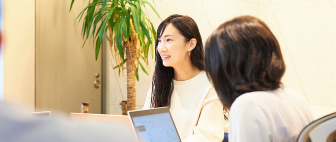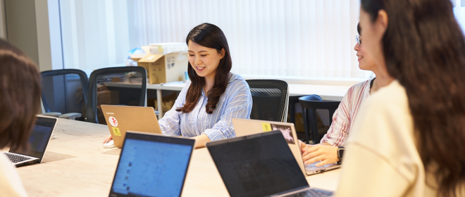 「自分をひらき、仲間をひらく」という行動指針があり、なんでも話しやすい雰囲気や関係性を大切にしています。勤務開始のタイミングやミーティングでは「チェックイン(今のお気持ち共有)」が習慣化していたり、社内の情報もslackでオープンにやりとりしているため、自分のチーム以外の情報もリアルタイムで確認することができます。
