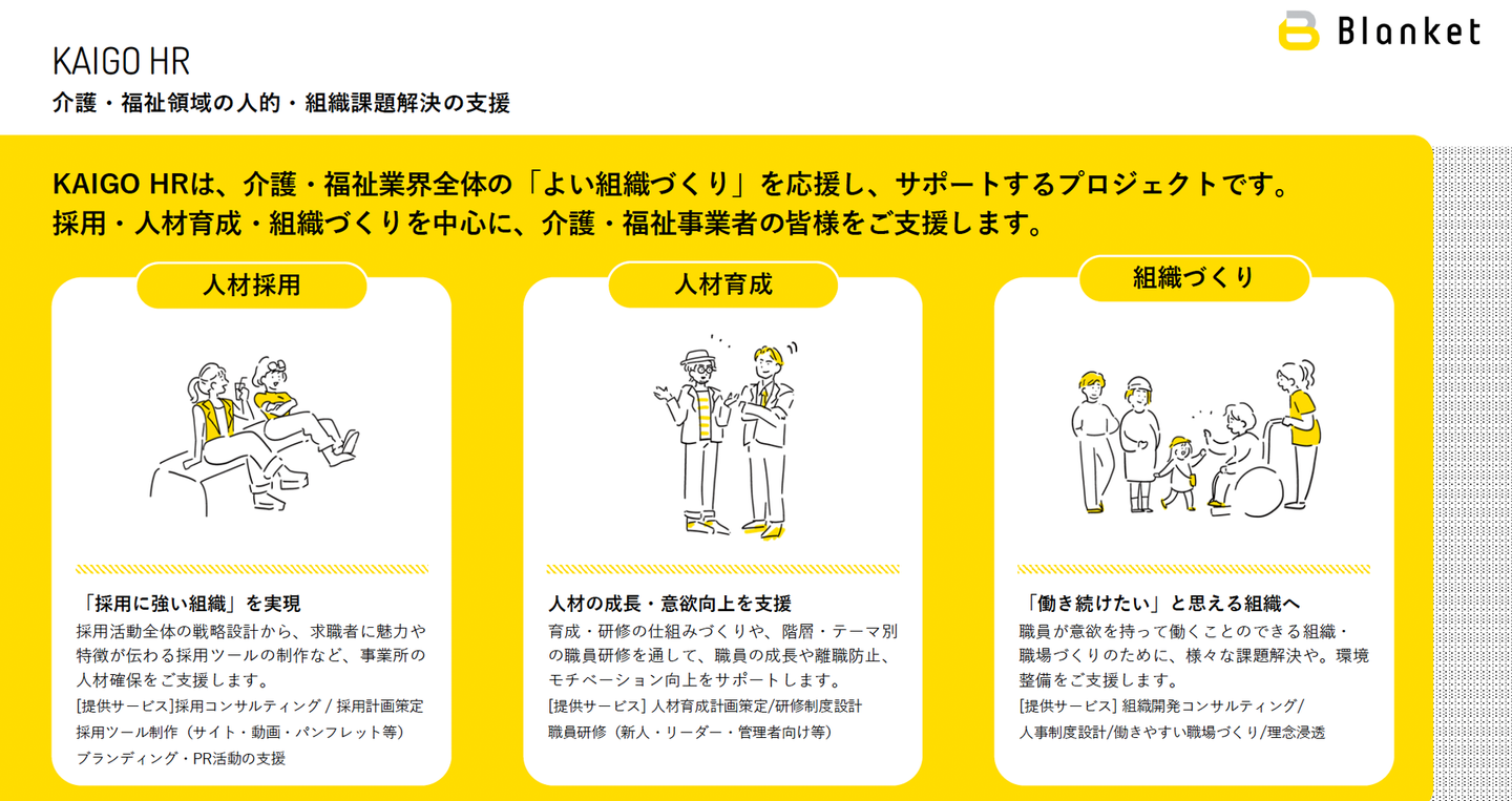 Blanketは、介護・福祉事業者に伴走しながら、人材採用・定着・育成を支援しています。介護・福祉事業は何より「人」が大切となる事業。だからこそ、事業者・そこで働く人たち・サービスを利用する人やその家族にそれぞれにとって、「よい組織」をつくることは大切と思い、様々な形で介護・福祉事業所の「よい組織づくり」をお手伝いしています。