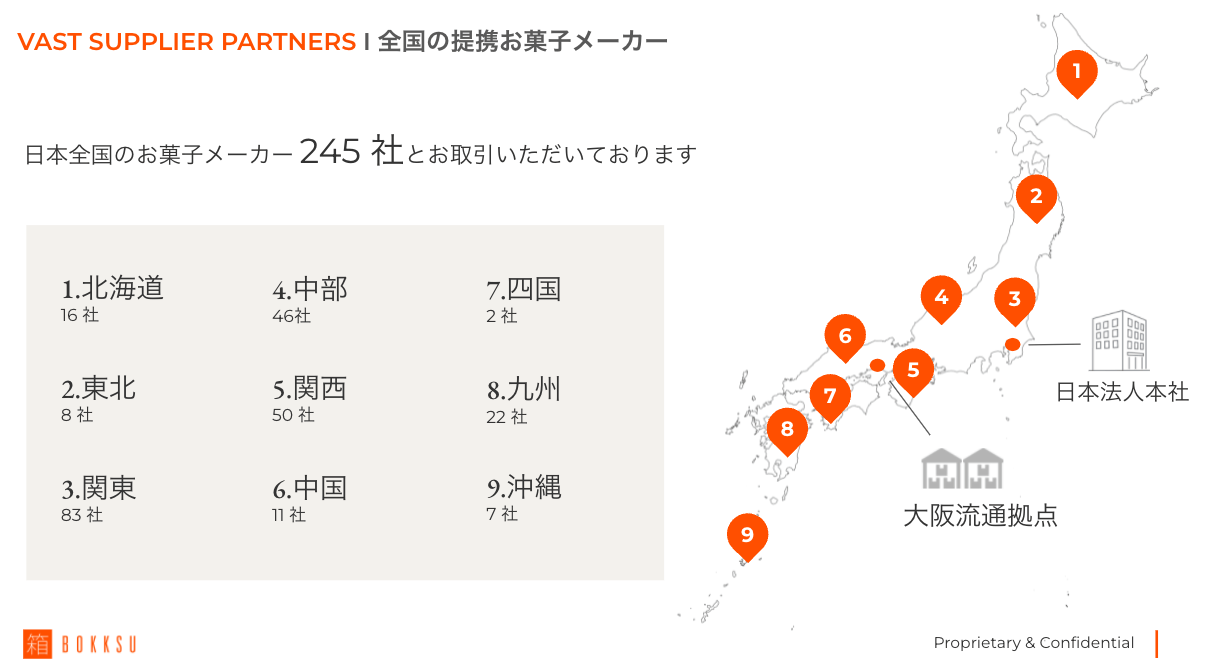 そのために大切にしているのは、日本全国にあるお菓子メーカーさんとのつながり。Bokksuのサービス開始から6年。初めは何のツテもない状況でしたが、今ではBokksuの企業理念に共感してお取引してくださるメーカーさんが250社近くにのぼります。