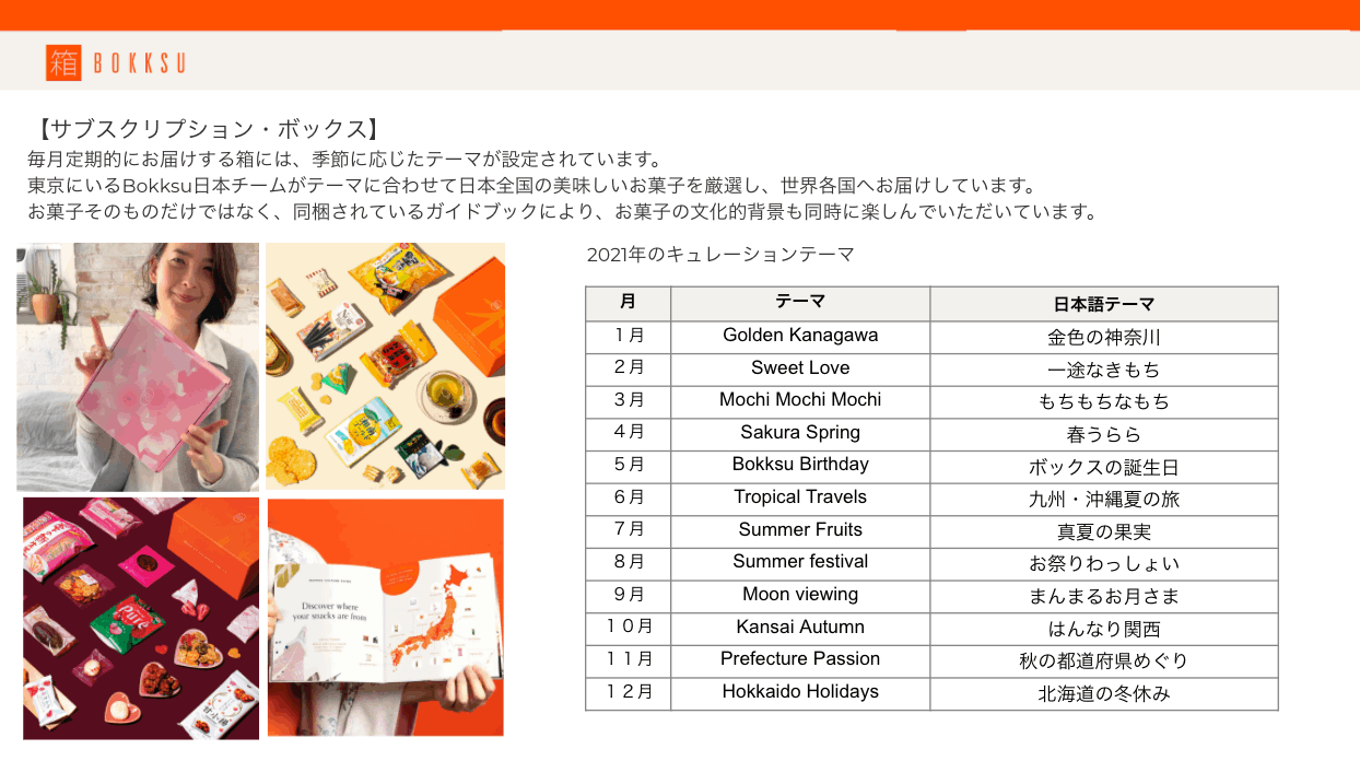 本題に入る前に、当社Bokksuのコア事業であるお菓子のサブスクリプションボックス(Bokksu Subscription)についてご紹介します。
