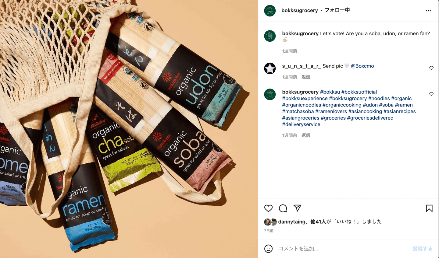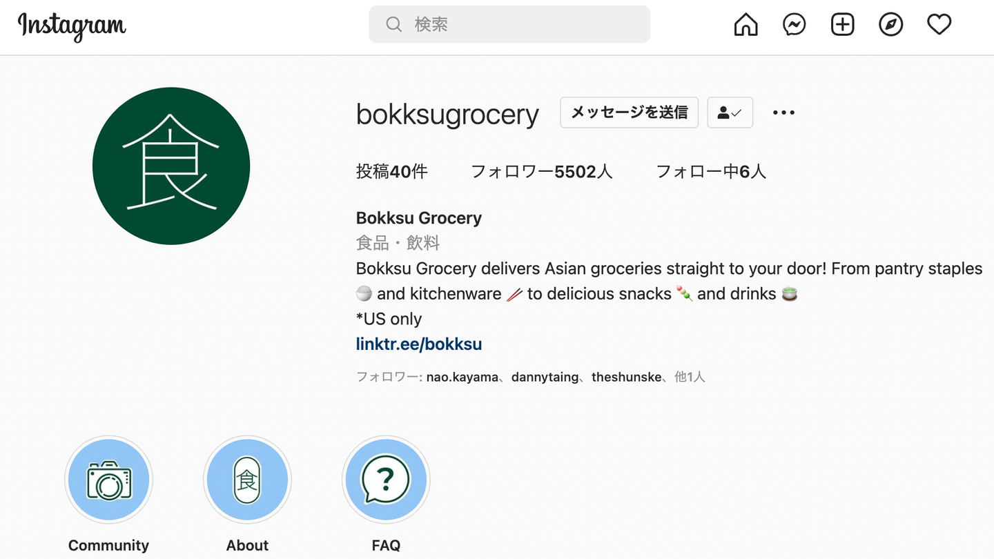 こちらは昨年10月にローンチしたばかりの新事業、米国限定でアジアの食料品をお届けするオンライン・グローサリー(Bokksu Grocery)のインスタグラムです。