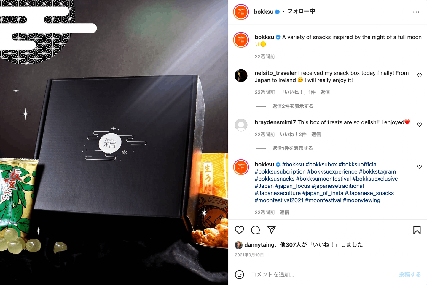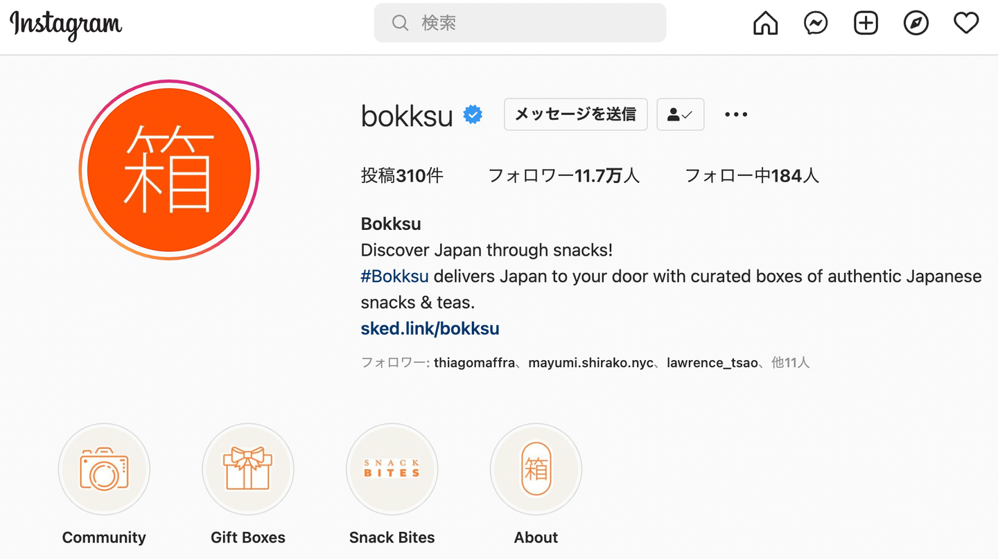 Bokksuが創業当初から取り組んでいるコア事業がお菓子のサブスクリプション・ボックスですが、それをご紹介しているのがこちらのインスタグラム。とてもありがたいことに、11.7万人もの方にフォローいただいています。https://www.instagram.com/bokksu/
