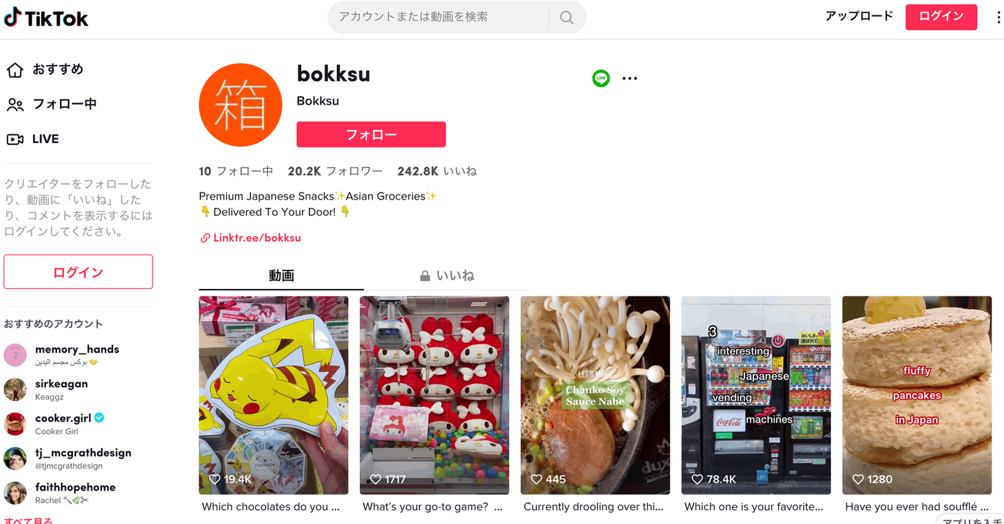 そしてBokksuの中で最近最も勢いのあるメディアがこちら、動画メディアTik Tokです。インスタグラムよりもカジュアルな雰囲気で、日本の街の様子やBokksu Groceryの商品を使ったレシピ動画、プチ日本語講座などを投稿しています。