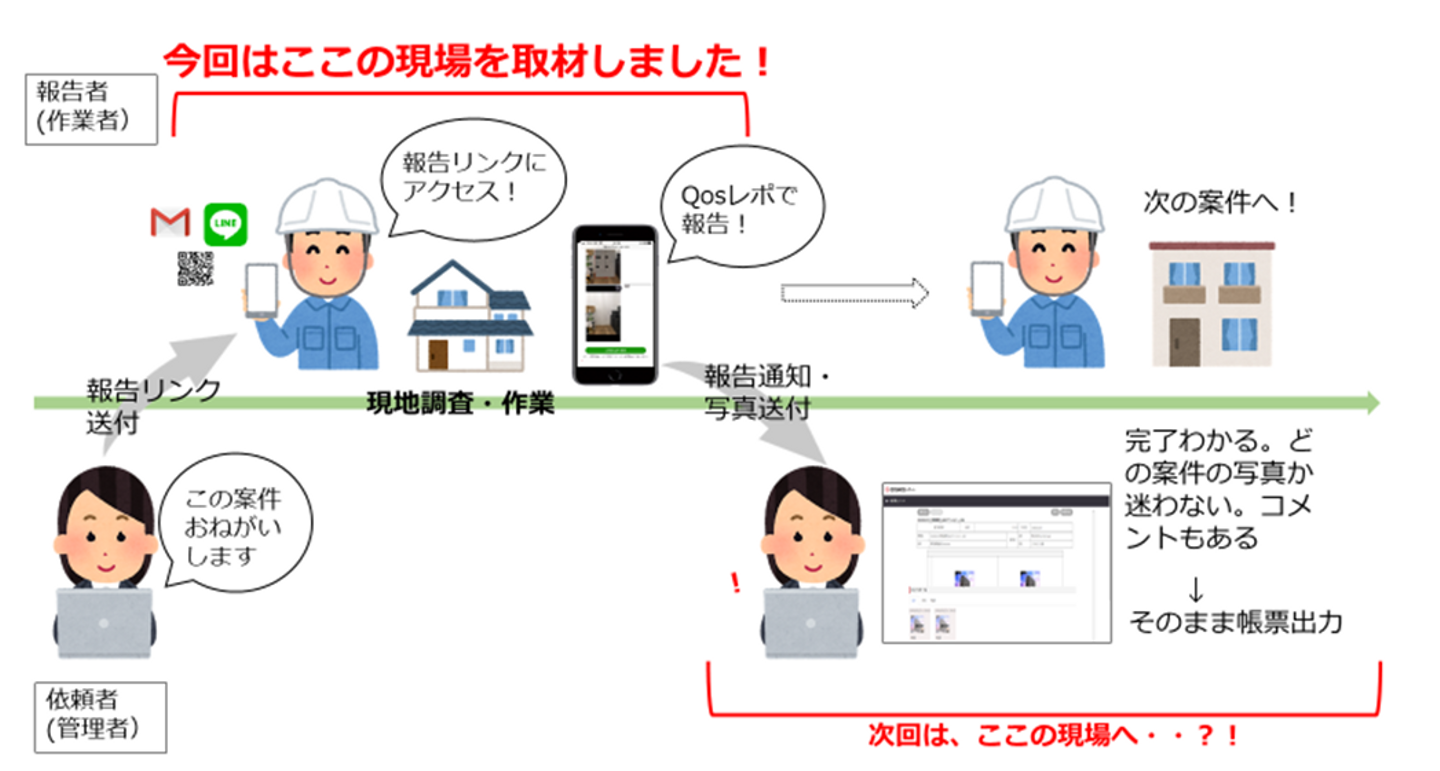 Qosmosレポートとは、協力企業や現場の職人作業員の方への「組織をまたぐ」作業の依頼、写真報告の回収を最もカンタンに行えるWEBサービスです。