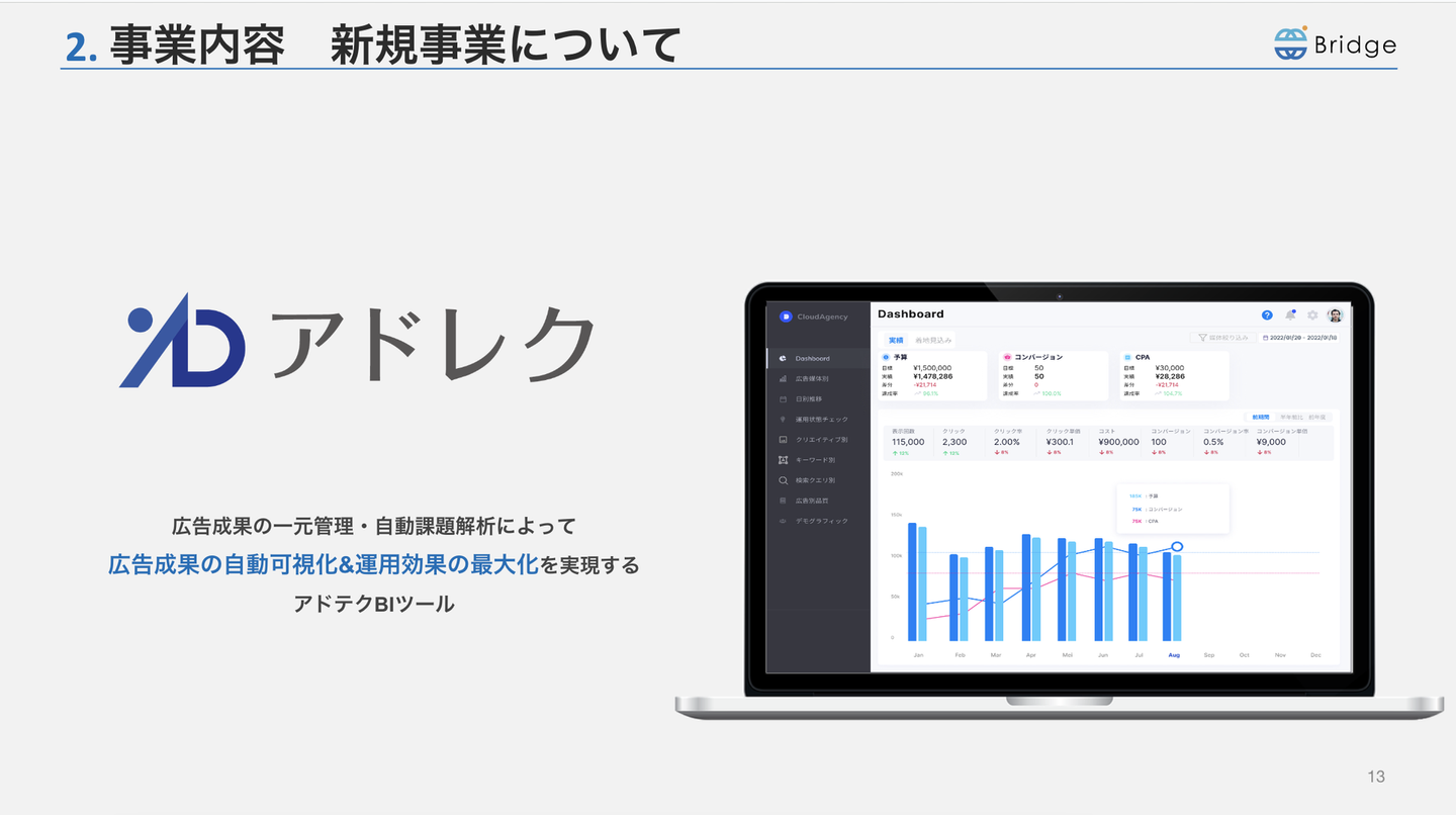 2つ目の新規事業部では、自社で開発した新しいツール”アドレク”の開発と企業への提案を行っています。アドレクは広告運用の分析を自動で行い、点数化することで運用状況を客観的に把握することができるツールです。このツールを企業に提案する活動を行っています。どの業界、どのような企業へ営業をかけるべきか営業全体の戦略も考えながら、目の前のお客さんへのアポイント獲得、商談から受注、フォローアップまで幅広い業務を担当しています。