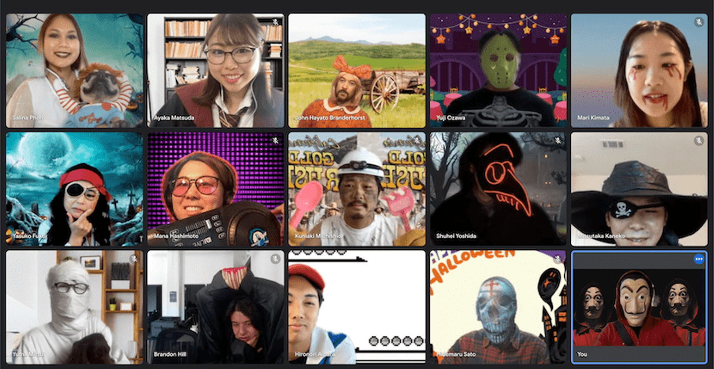 どのスタッフも自身の仮装のみならず、オンラインならではのミーティングのバックグラウンドにもこだわっています;)