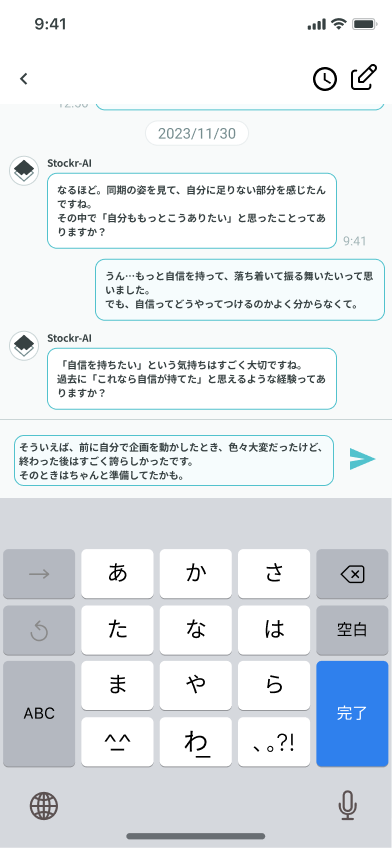 ですが、濱崎さんと納得いくまでディスカッションしつつ、他のアプリでAIが使われているものを徹底的に調査し、Stockrの機能に落とし込むにはどうしたら良いかを考え、ユーザー視点を忘れずに取り組んだ結果、自信を持って提供できるAIコーチング機能ができたと思います。