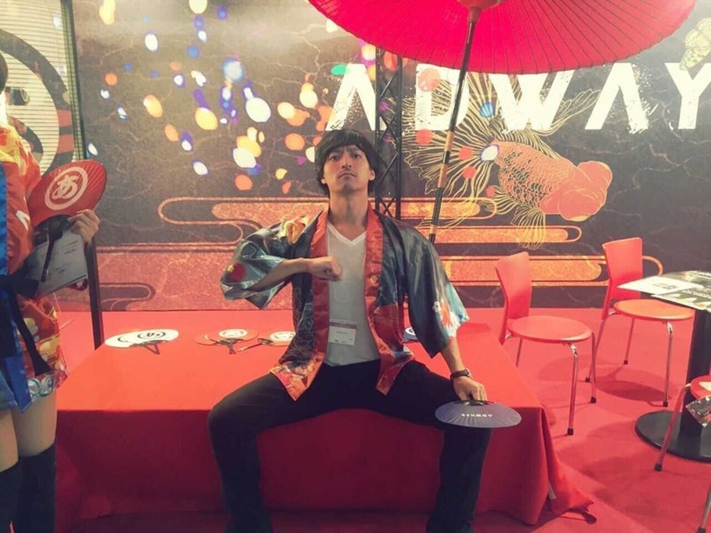 ▲出展した東京ゲームショーのブースにてドヤ顔する新卒時代