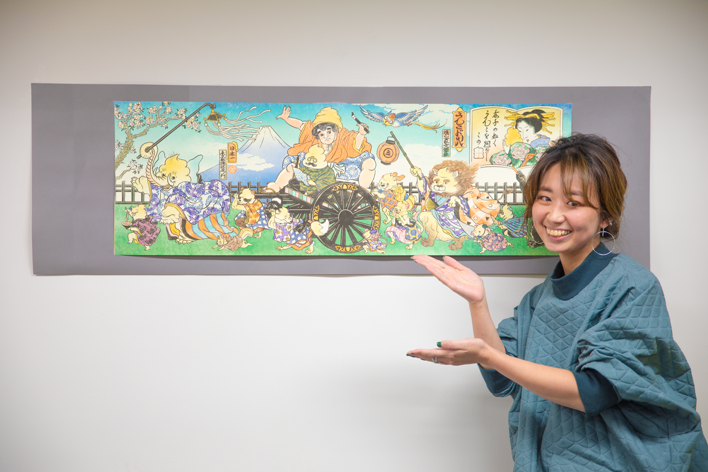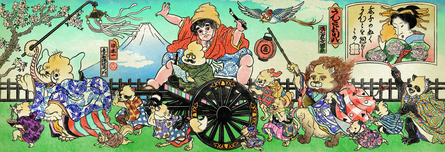 ▼穂坂が1人で描き上げた「うんこドリルの浮世絵」。2019年11月にドイツのフランクフルトで開催された世界最大級のブックフェア出展の際に使用され、海外からも大きな反響を受けた。